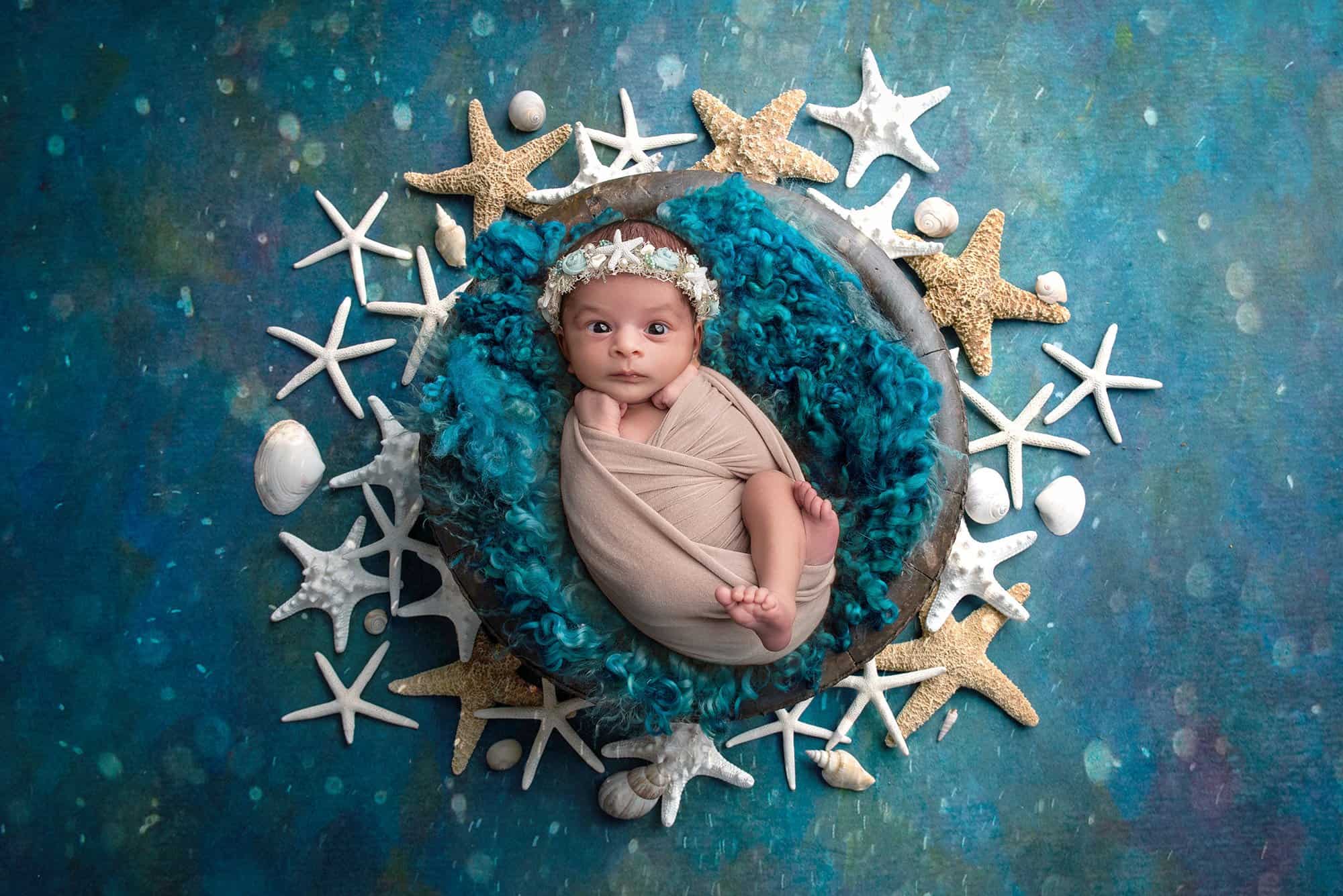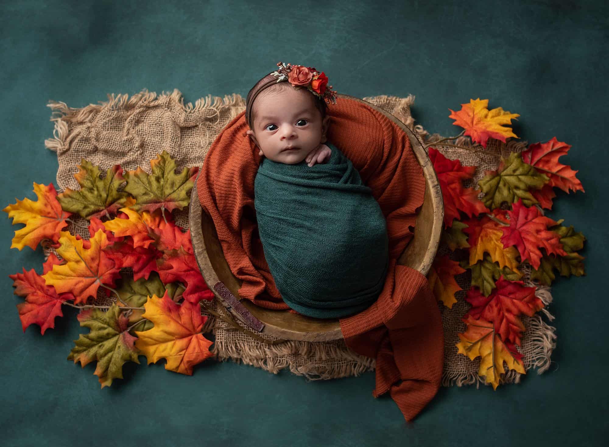 Mom and Dad love creative photography and they wanted as much color as possible, so we had a great time pulling out all the stops! I was able to capture adorable photos of Aarya in a wide range of colors and themes, from autumn leaves to beachy blues. All the pictures turned out wonderfully, but the shot of Aarya in her teddy bear outfit and curled up in a wooden honey pot is absolutely adorable.