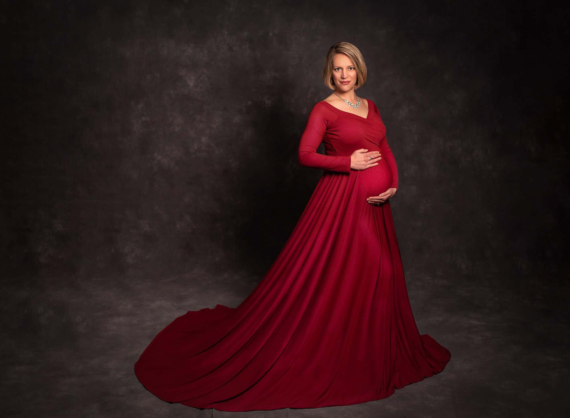 dramatic red maternity dress, maternity photos glastonbury ct, maternity portaits, winter maternity photos, winter maternity photos no snow