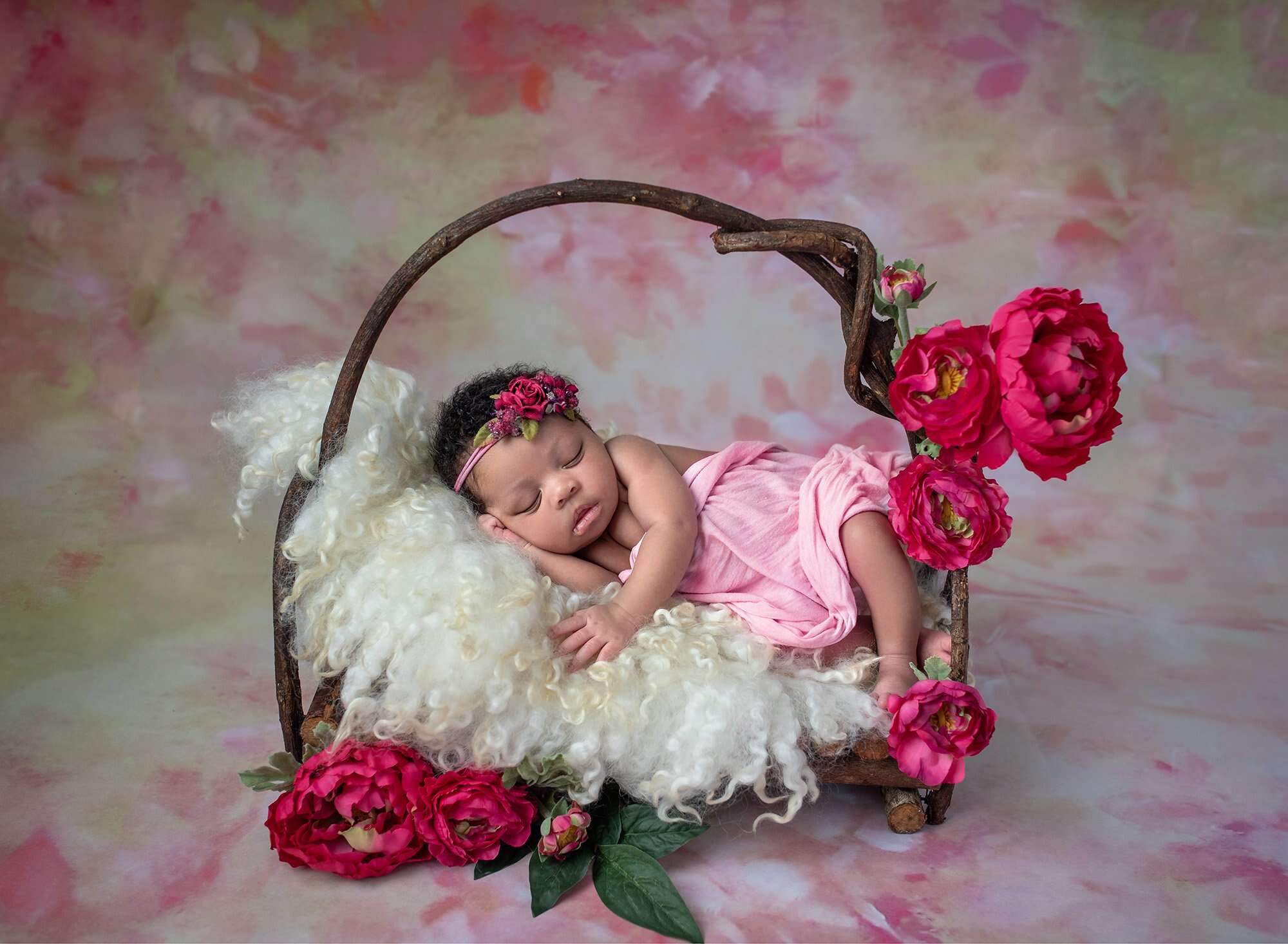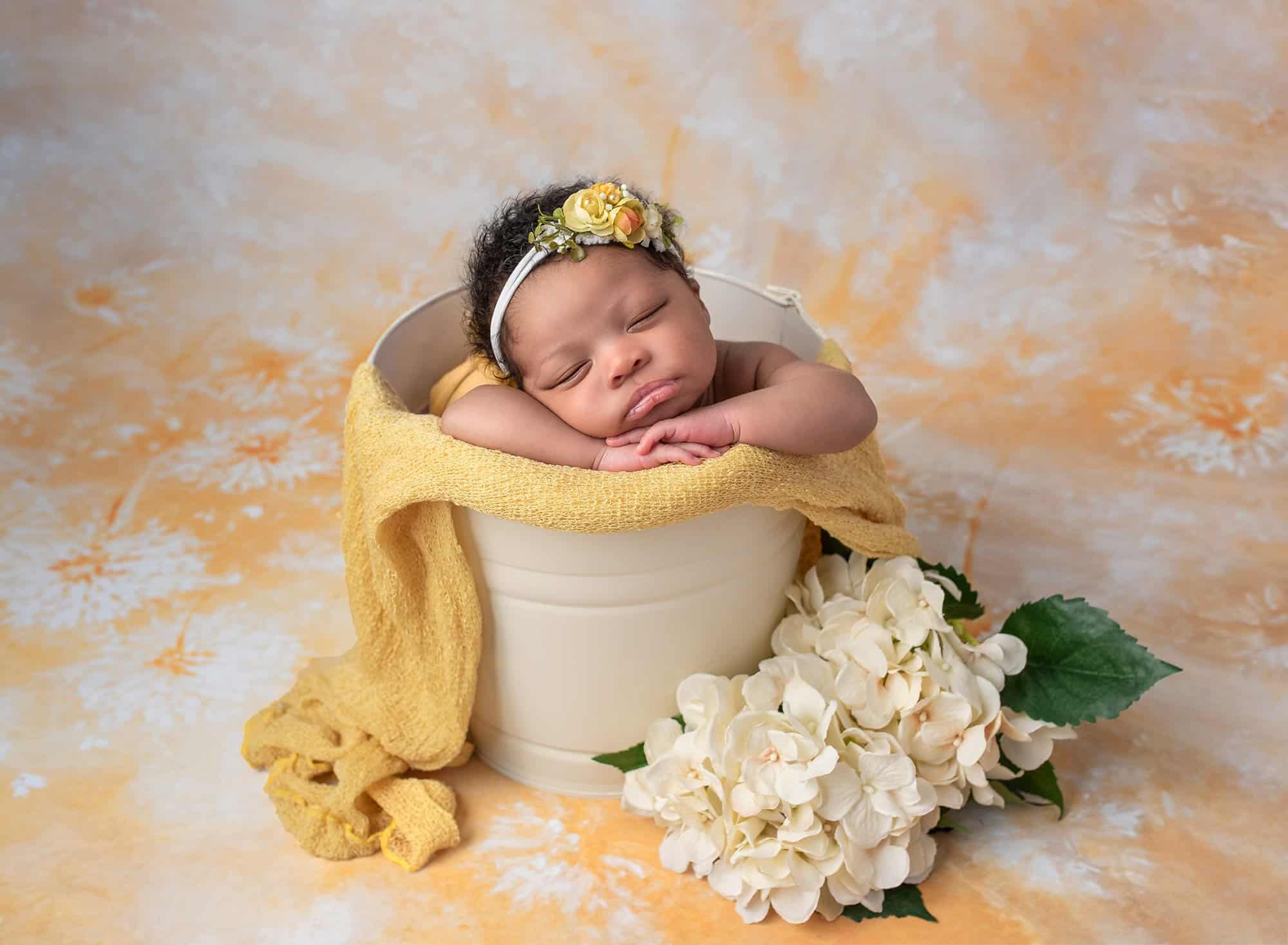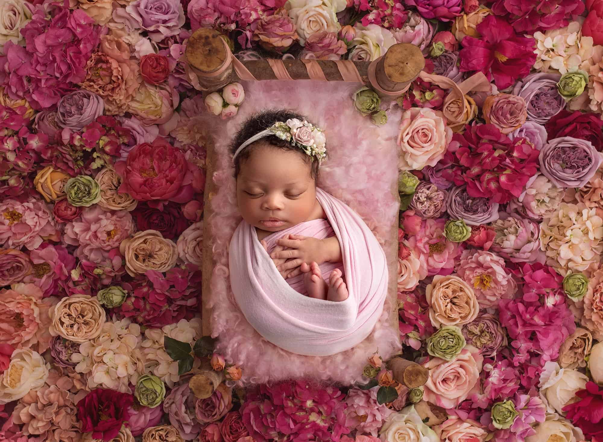Of course, it wouldn’t be a baby girl’s newborn photos if we didn’t get some adorable portraits of her with the girliest possible scenery, too! She looks like an absolute queen surrounded by vibrant and colorful flowers. Throughout the session, Penelope was a dream to photograph as well.