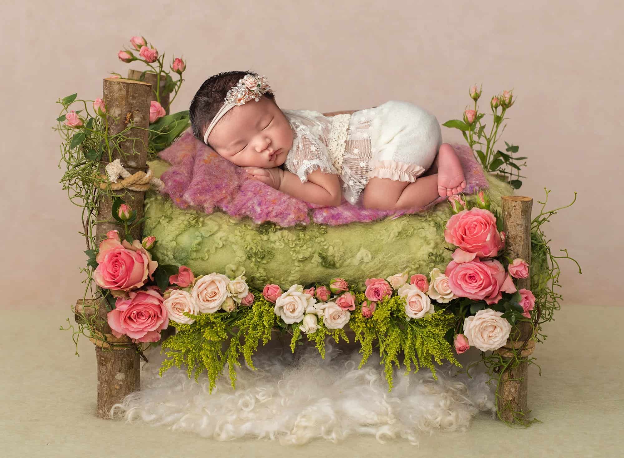 Posed studio portraits: Baby is carefully wrapped, supported, and placed in cozy sets or on a simple backdrop. Think peaceful expressions, tiny details, and a clean, timeless look.