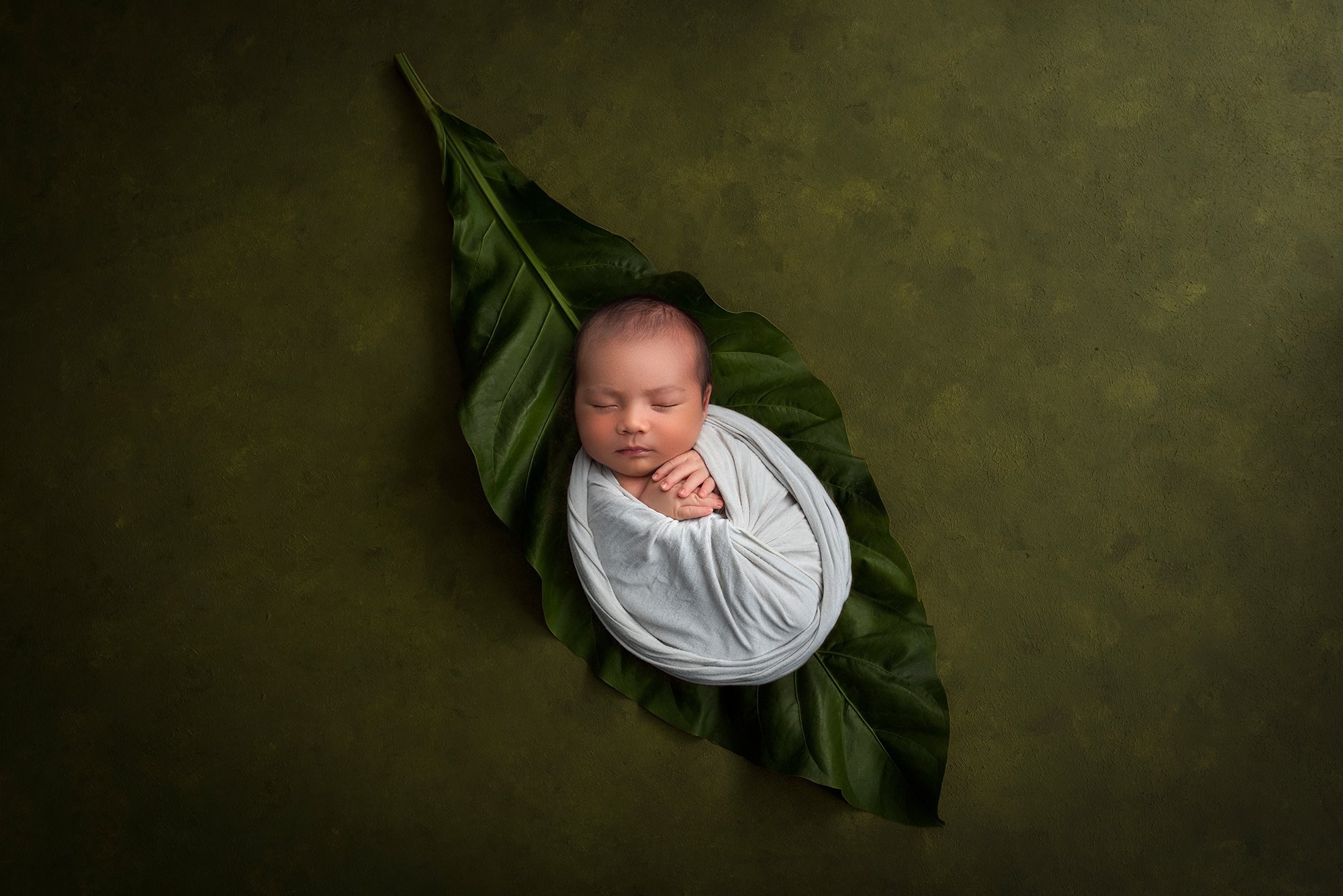 Wanting to get plenty of classics for this adorable big baby, his newborn boy photoshoot had all the essentials: a blue color palette, fuzzy friends, and plenty of sleepy poses that make for the cutest newborn photos. We also made sure to incorporate some artistic images that highlighted this family’s love of nature, including baby Carter on a giant leaf and, a forever favorite of mine, little Carter cradled on an elephant’s trunk.