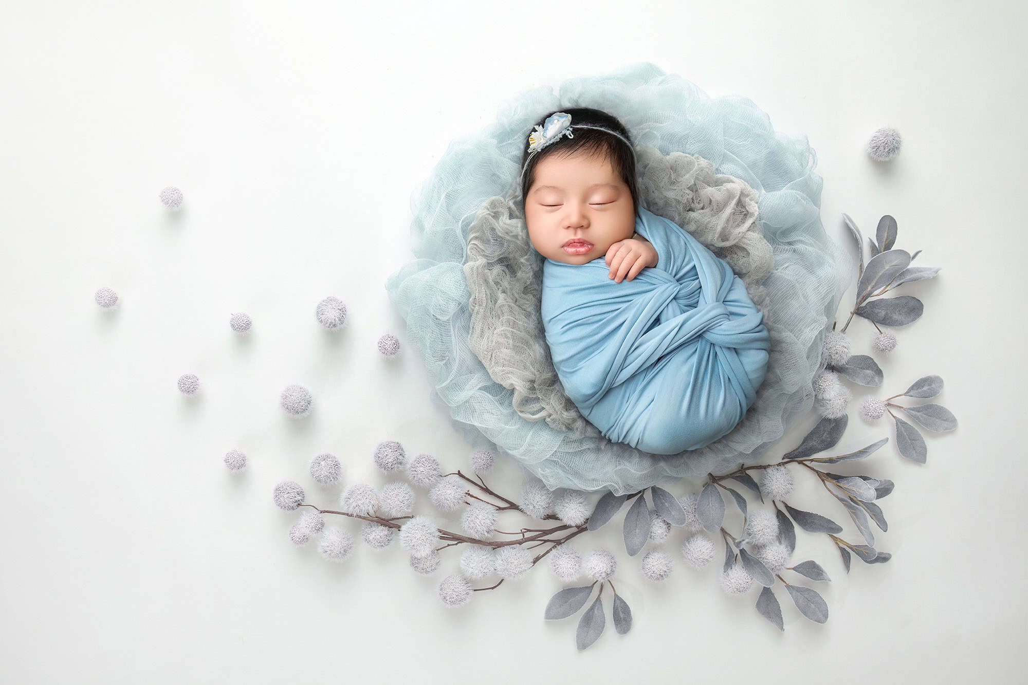 Minimal styling lets every tiny feature shine. We swaddled baby in blush and then in pale blue. I used neutral textures and flattering side light to highlight those perfect lashes and lips. We added a few calm sleeping poses on a textured blanket and a classic profile in parents’ hands. Each setup took only a few minutes, keeping baby comfortable and sleepy.
