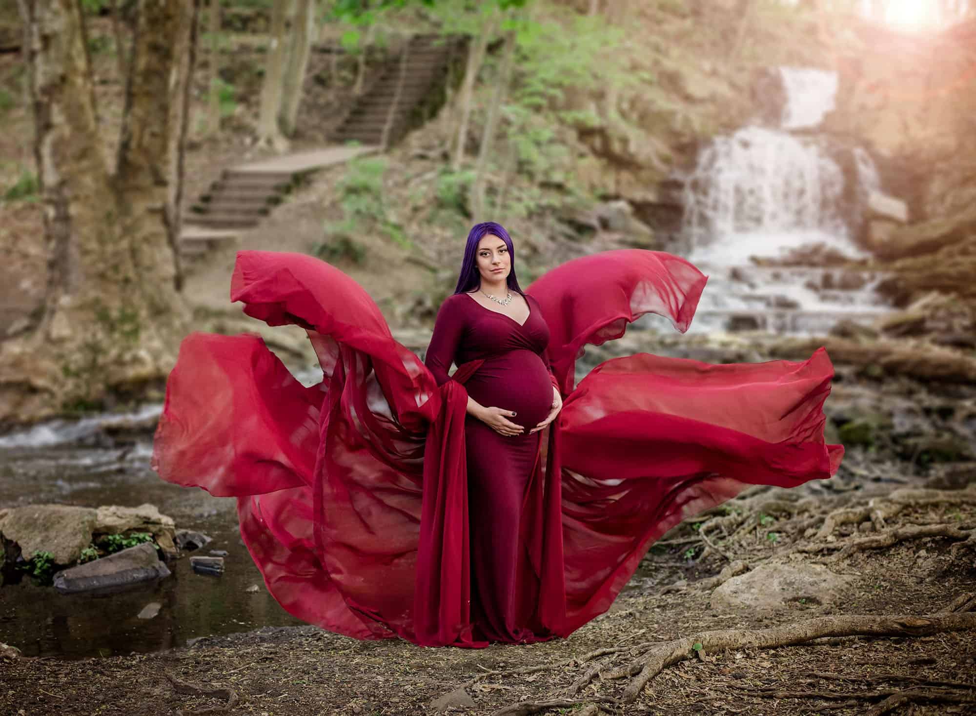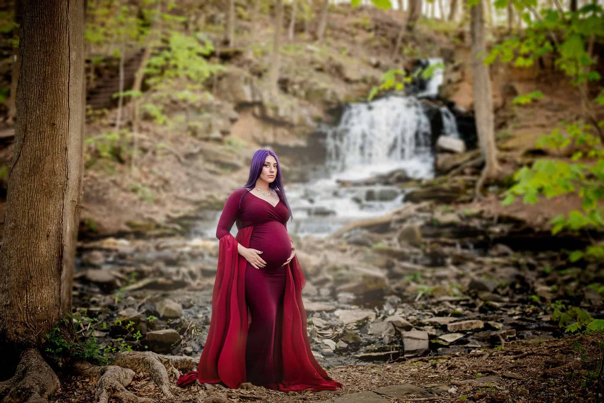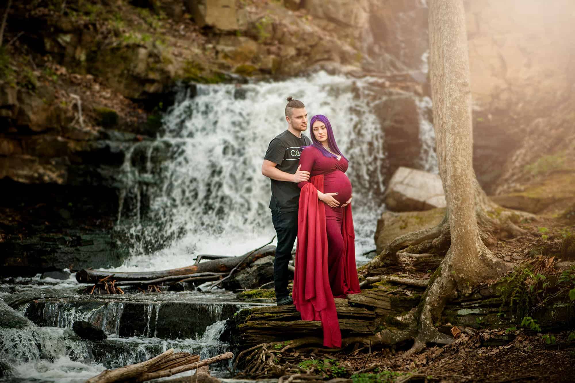 Since we needed to have an outdoor photography session, and we wanted it to match their outgoing personalities, we decided that the location should be at a stunning wooded waterfall nearby! They loved the idea of taking some photographs right by the edge of the water. Mom was absolutely fearless climbing up the rocks with the help of Dad! She was bound and determined to get a photo of the waterfall in the background with the train of her dressing flowing down below her. She picked such a gorgeous dress for this shot too. The maroon flowing gown looks stunning on her!