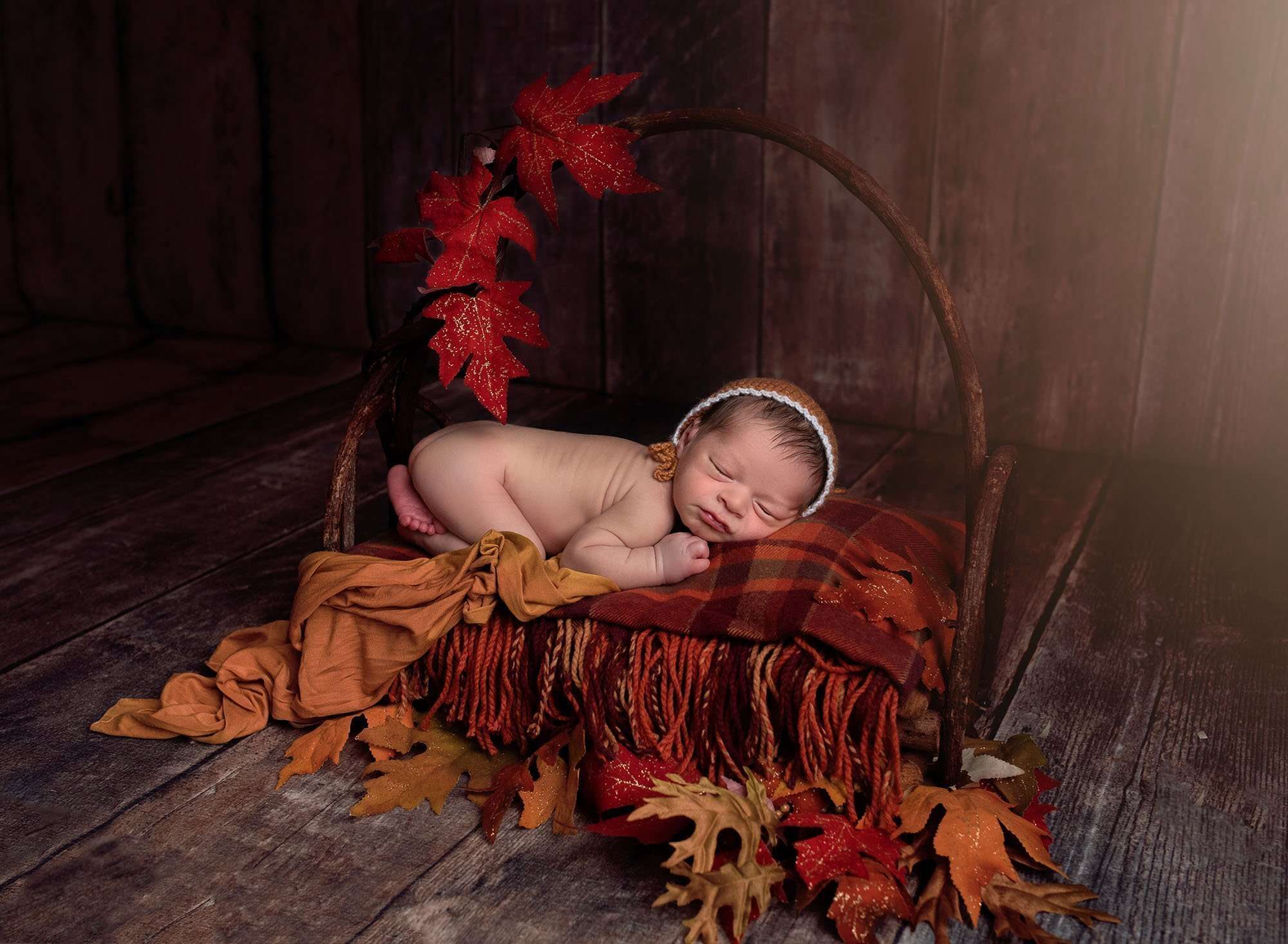 Think layered knit blankets in varying tones of caramel and cream, perhaps with a knit bonnet or simple wrap. These minimalist setups keep the focus on your baby while the fall colors and textures add seasonal context. The creative use of props allows for storytelling within the frame without overwhelming the main subject.
