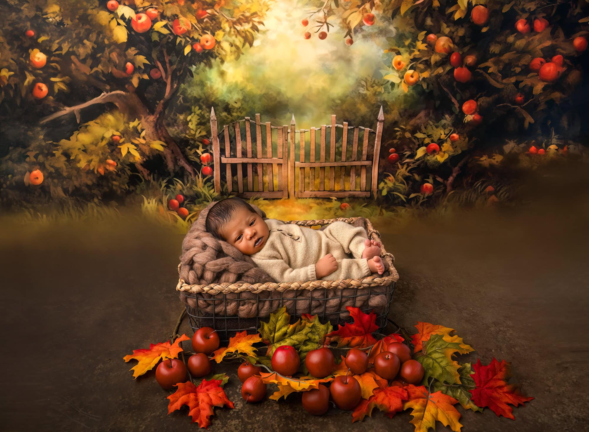 The magic hour effect can be recreated in studio through careful light positioning and warm-toned backgrounds. This gives you that golden, backlit autumn glow without requiring your days-old newborn to venture outdoors.