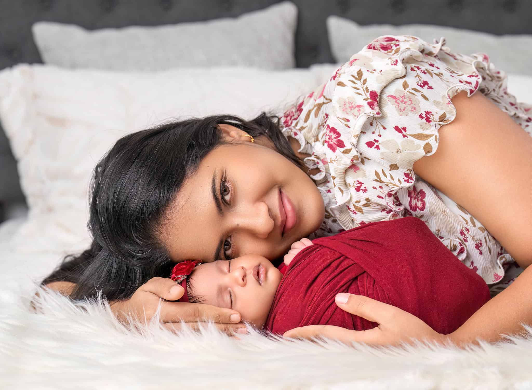 We leaned fully into our fine art style with Dhanya’s final solo portraits. In one, she is curled inside a blooming red rose. In another, she lies peacefully inside a purple anemone. The last image shows her nestled in a tree hollow, encircled by soft pink orchids. These floral elements added a sense of whimsy and wonder, highlighting the beauty of new life in the most magical way.
