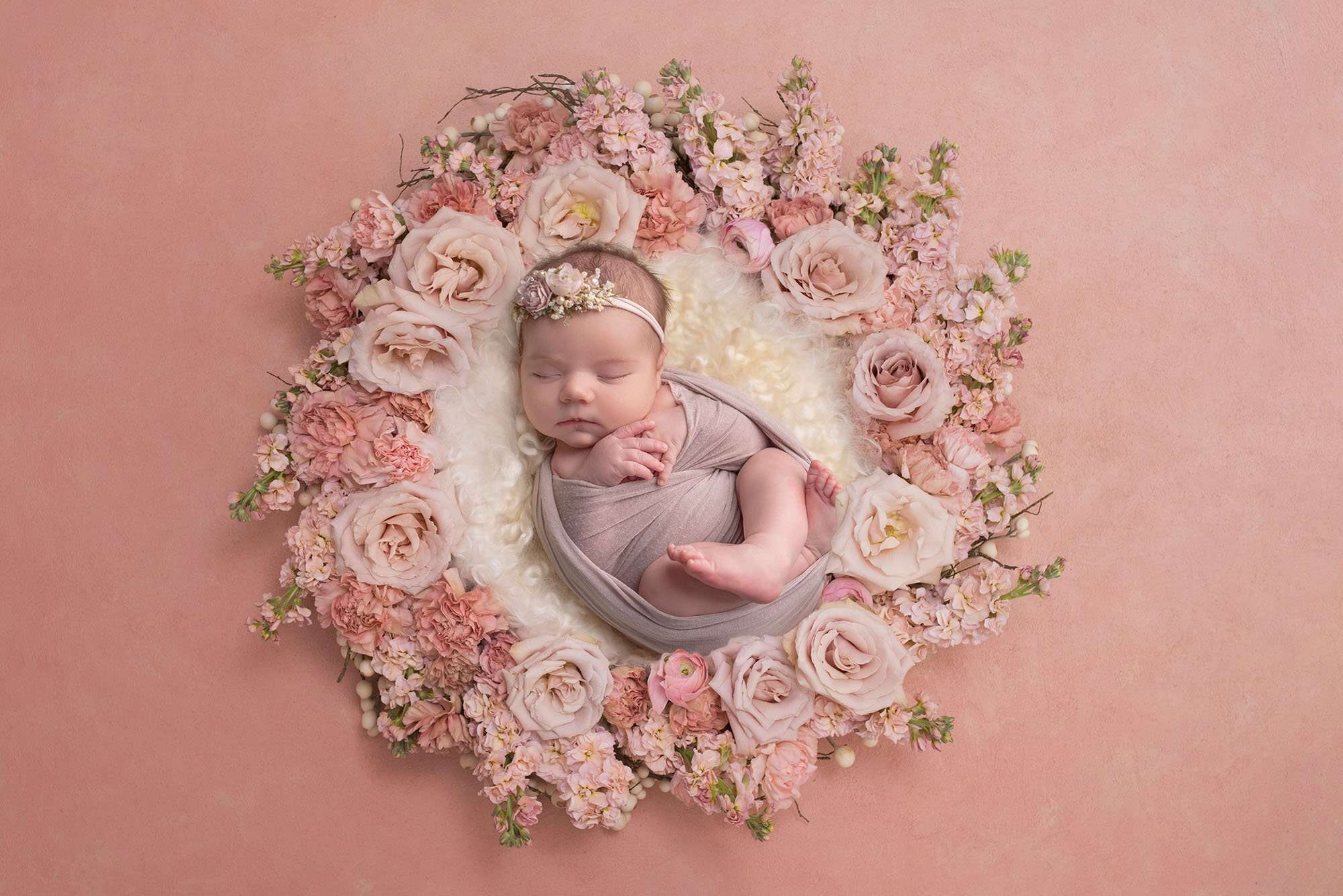 Everything else was to be pink and floral and as feminine as possible! I mean, can we talk about the fluffy bed in the floral wreath? That is about as feminine as you can get. I absolutely love that theme! The big roses amidst all the other pink flowers makes such a darling backdrop. Her floral headband is the perfect finishing detail.