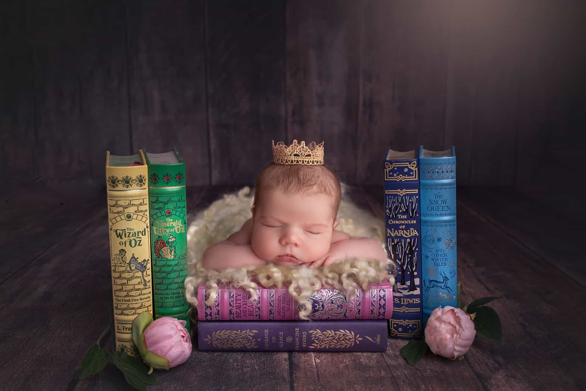 Both Mom and Dad are huge readers, so they wanted to incorporate some of their treasured collection into Aria’s newborn session. What’s better than sharing your favorite hobby with your favorite person? I know this little girl will be read bedtime stories every night. Probably from some of the same books they brought in for the session! The covers were so vibrant and beautiful. What wonderful, fantastical books for Aria’s imagination to grow. I love her little crown. Already such a little princess. I love how she is sleeping atop the books; it makes me think of all the times she will fall asleep reading one of her favorite tales.