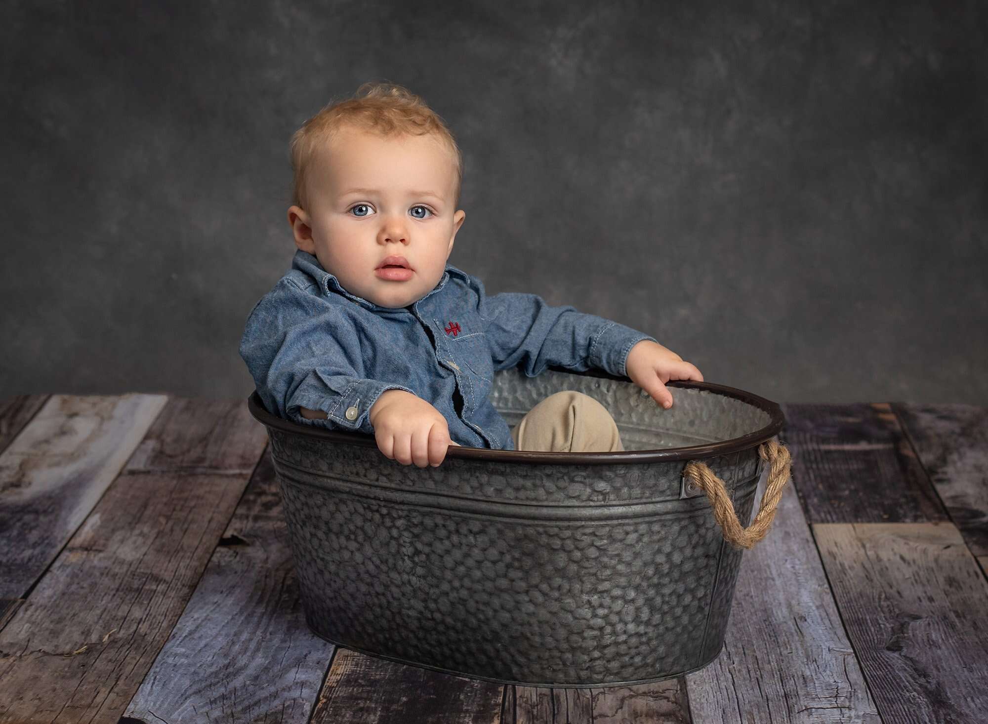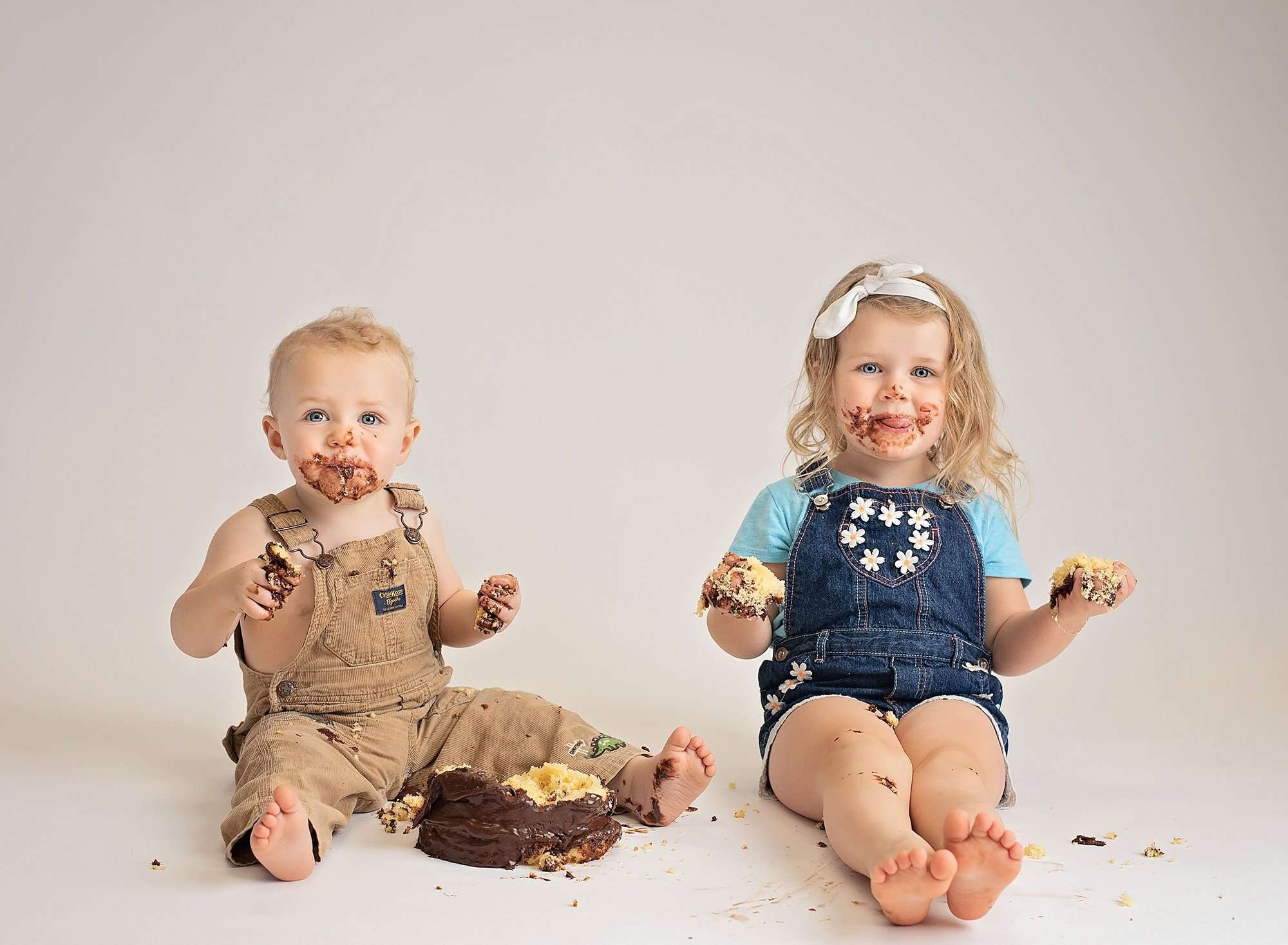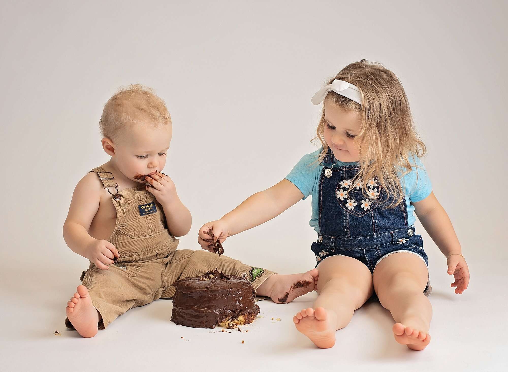 I loved the blue and khaki color scheme for the session, and we opted for a lineup of rustic props and pieces to complement their look. We finished up this indoor session with a cake smash, which is a must for a one-year-old’s birthday photos. We decided to make it a family affair, though, and Lyra had a great time getting in on the cake smash with her baby brother.