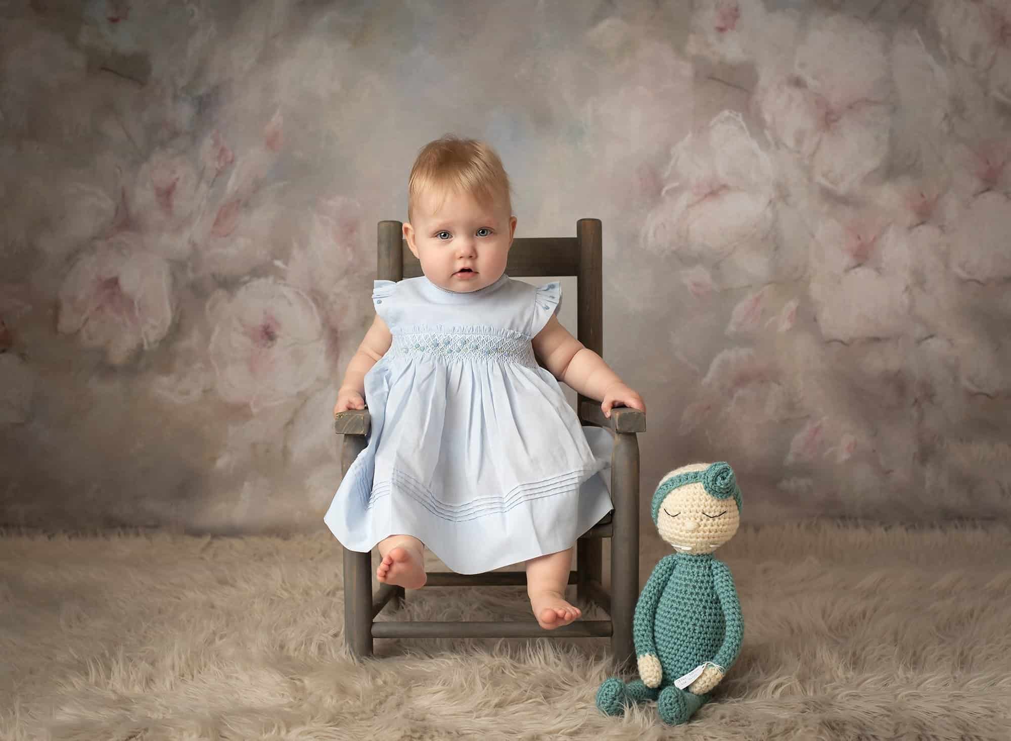 Oh, how happy I was to see this family again! I just loved seeing how big welcome Emilia and Johanna had gotten over the past year. These two stole my heart when their parents brought them in for their newborn session a year ago. They just celebrated their first birthday and came back to capture just how much they have grown since, and boy have they gotten so big so fast! The photos in the chairs with the dolls show how big they’ve actually gotten over the past twelve months. The dolls were created to be the exact size of each girl when they were born. These dolls are such a special keepsake and were a great way to document the girls’ growth.