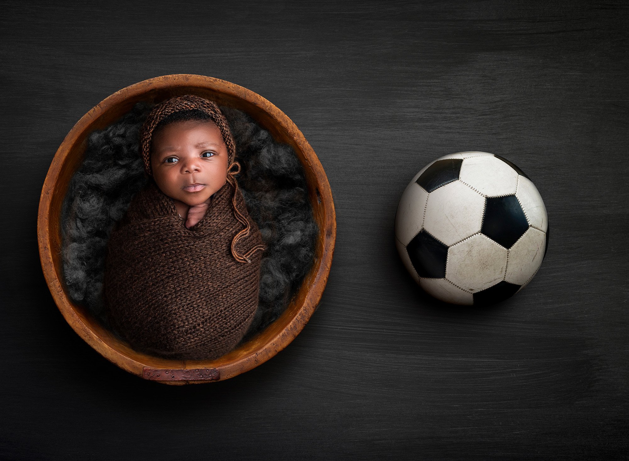 Stephen’s family wants their baby boy to grow up with a strong sense of his Jamaican heritage, so we made sure to pay homage to their homeland with a portrait of Stephen at the center of the Jamaican flag. This little guy is also lucky enough to join a family that loves sports, and he’s sure to follow in those footsteps, so I made sure to incorporate a soccer ball and football into his newborn photos.