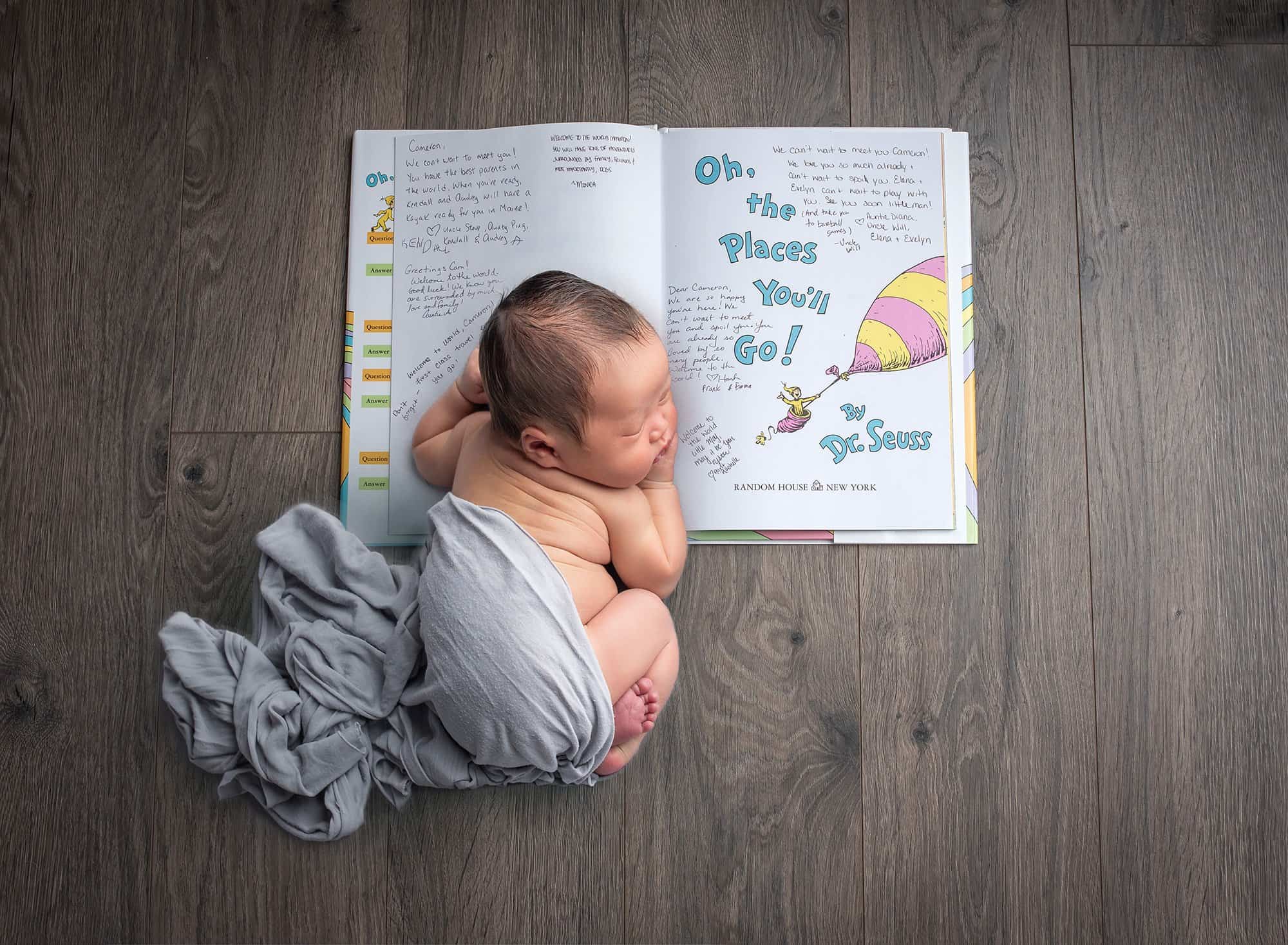 The photo of Cameron on top of his Oh, The Places You’ll Go! Book is absolutely precious, signed by so many people who are already swaddling him in love. Of course, the portrait of Cameron next to his incredibly proud (and furry) siblings would win over anyone’s heart too.