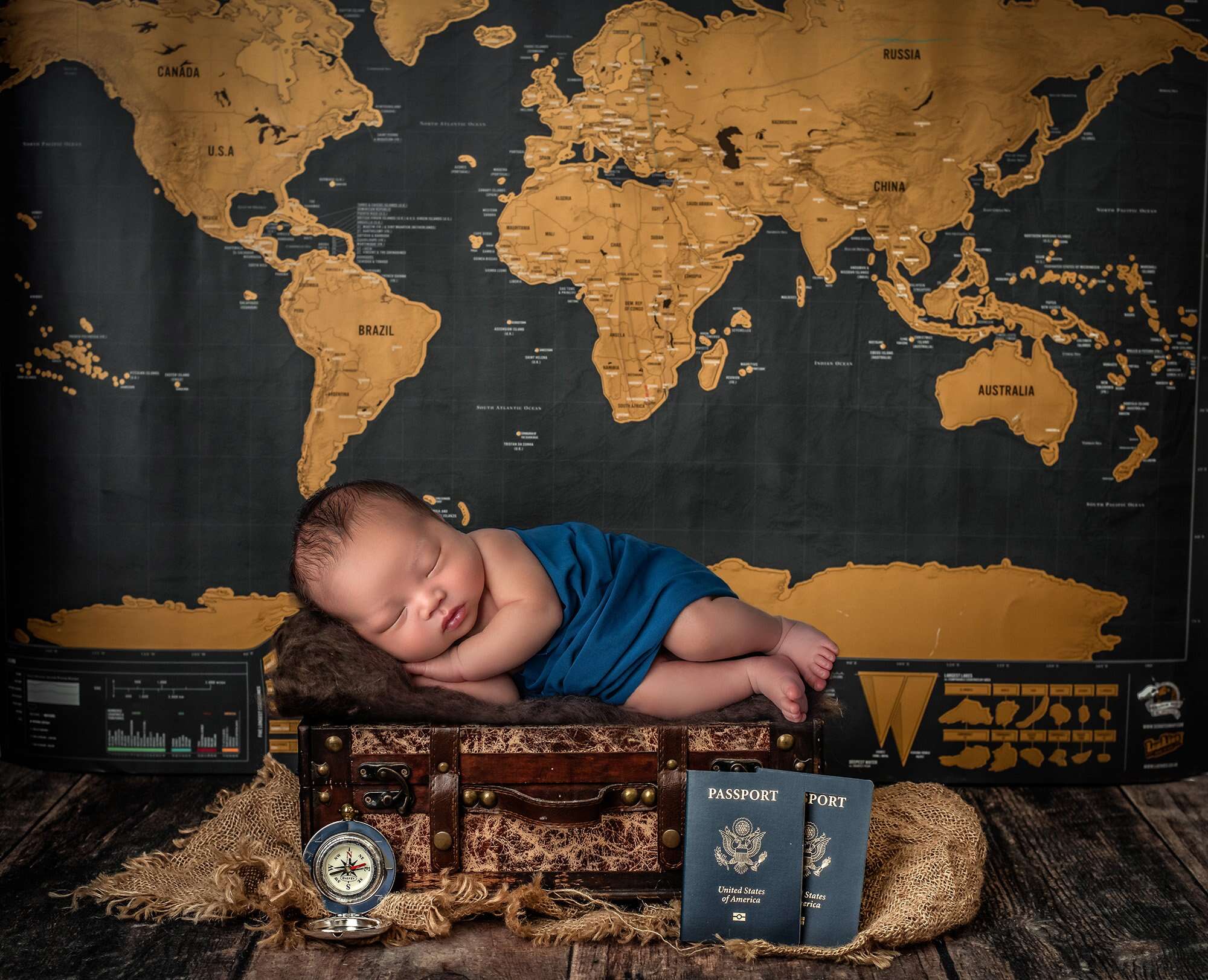 To help Mom and Dad get the family photos they had always wanted, we featured several unique settings and photos for baby Cameron. I love the portrait of Cameron surrounded by a map and his parents’ passports – Mom and Dad are clearly setting him up to be an avid traveler!
