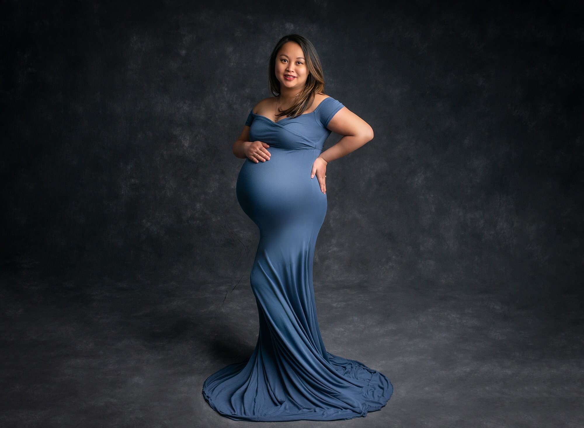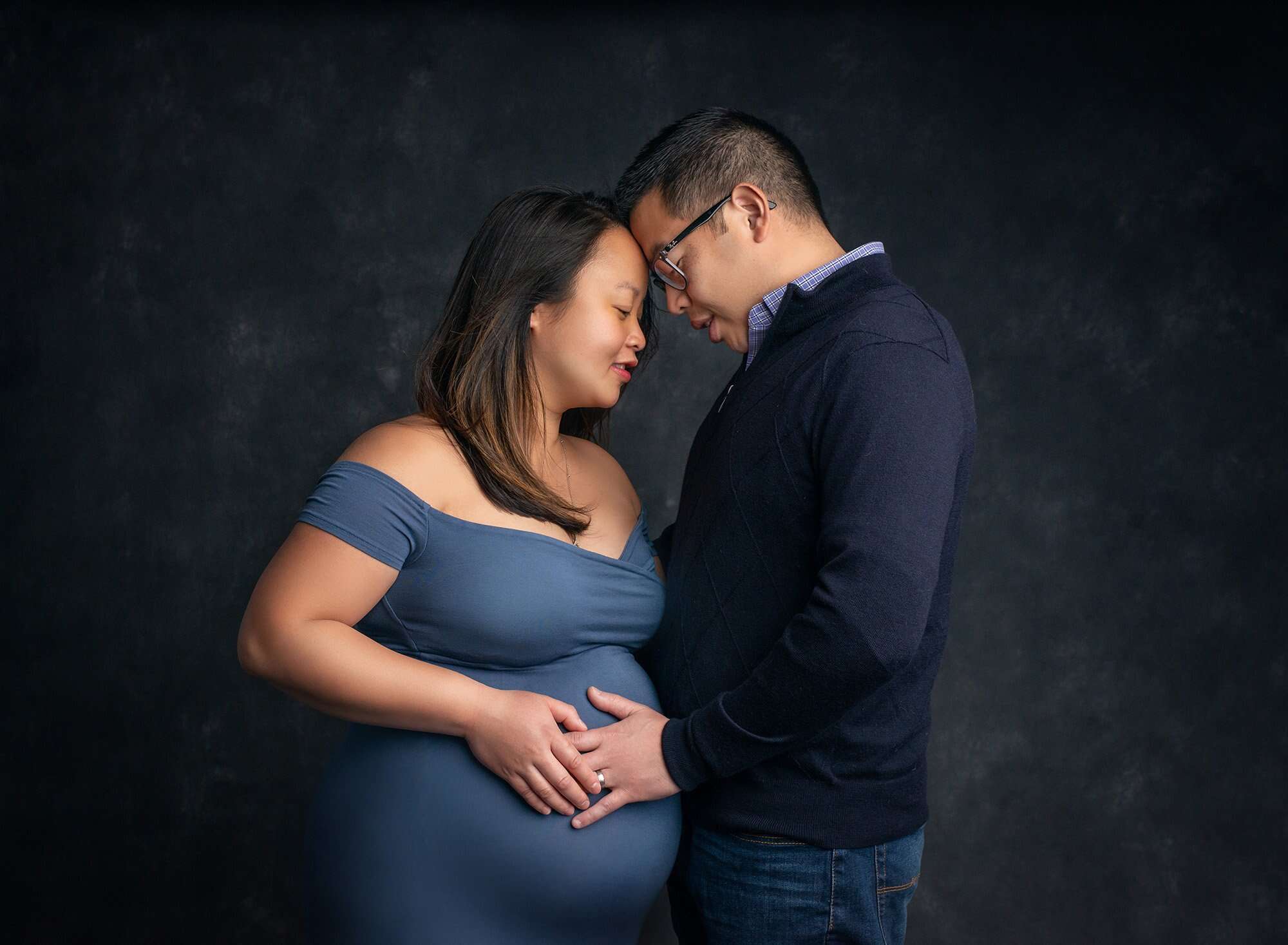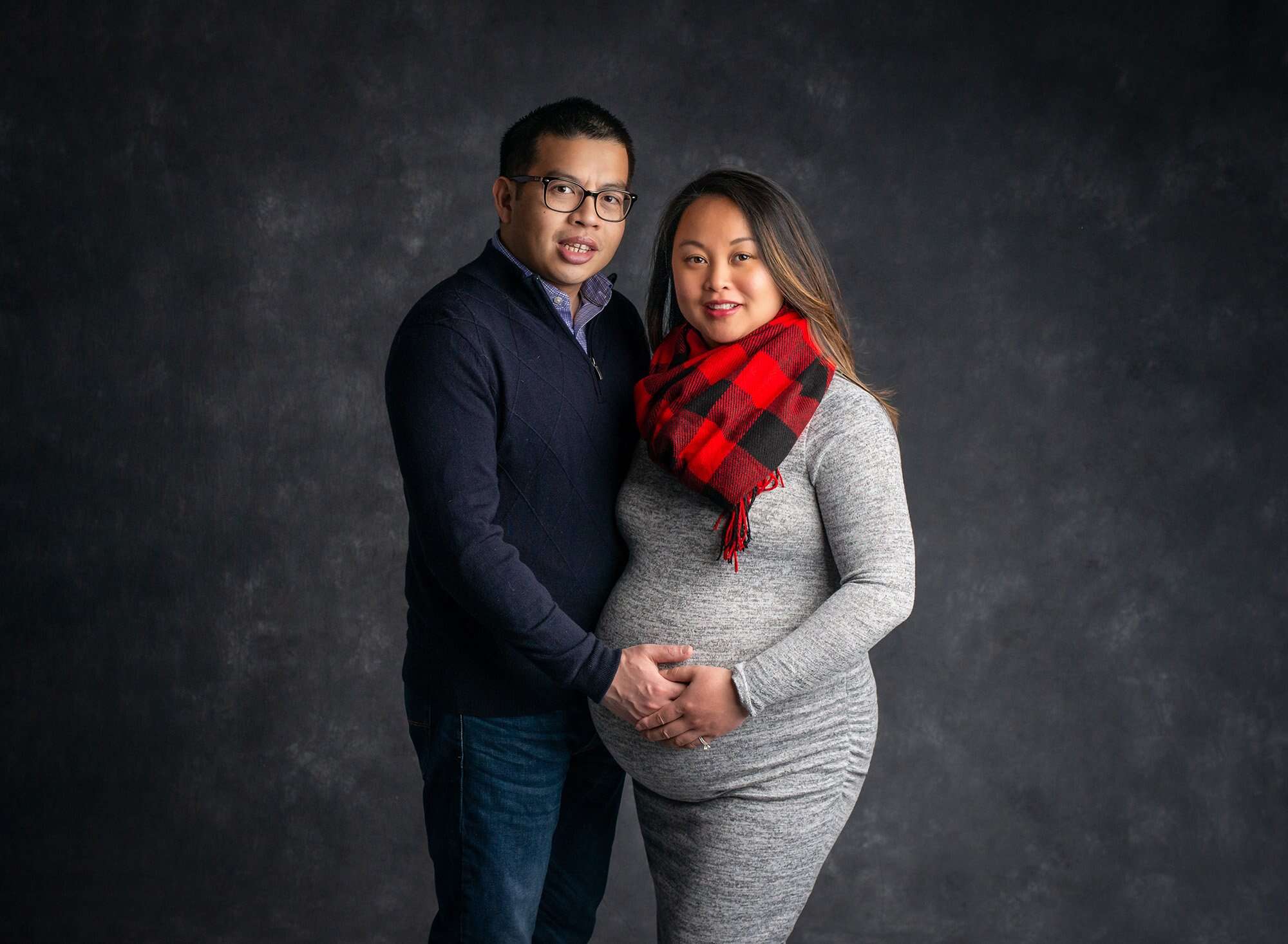 We started with Mom’s maternity photoshoot, and I could see right away how excited this sweet couple was to meet their baby boy. Along with some photos in casual and cozy winter attire, we were able to create several classic and dazzling portraits with Mom in a flowy maternity gown. The blue tones we used for the maternity photos allow these portraits to perfectly complement little Cameron’s newborn photos too.