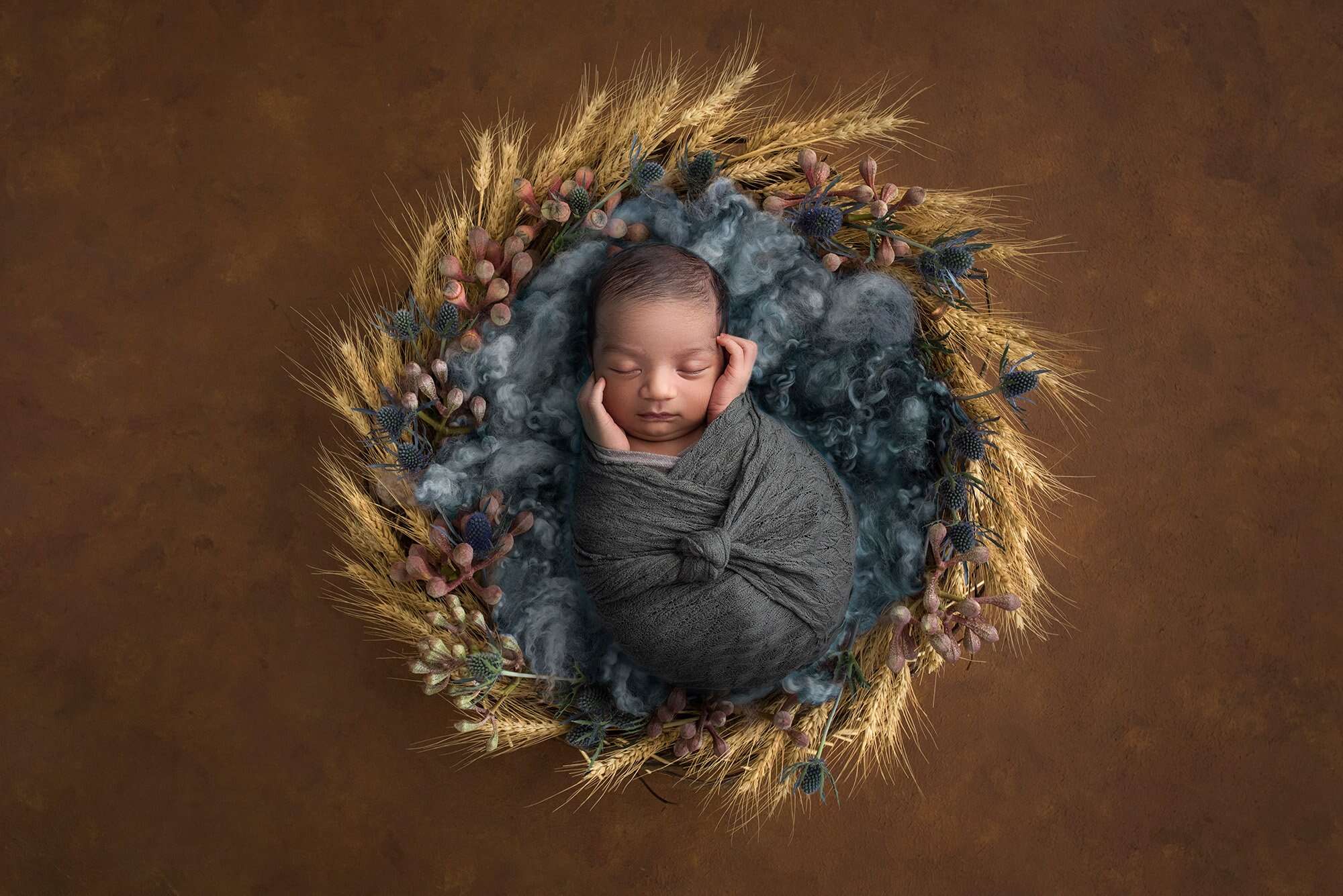 We used a green color palette for Neil’s portraits with his loving new parents so they would pair well with Mom’s maternity photos. We also played with a classic baby boy blue palette for many of Neil’s solo newborn portraits, and the picture of him cuddling a tiny teddy bear is absolutely precious. For a slightly more unique and personalized composite portrait, we photographed Neil below the phases of the moon.