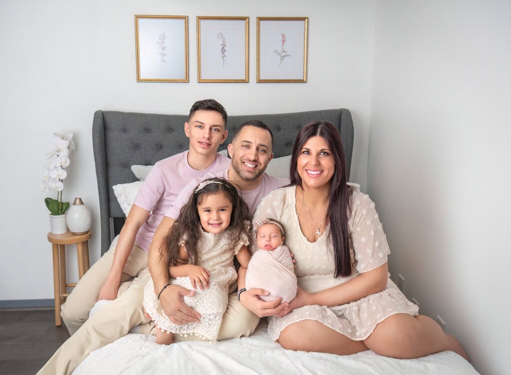 Family photos are a treasured part of any newborn and sibling photos session. Layered group posing is helpful for larger families, with siblings arranged by age or height.