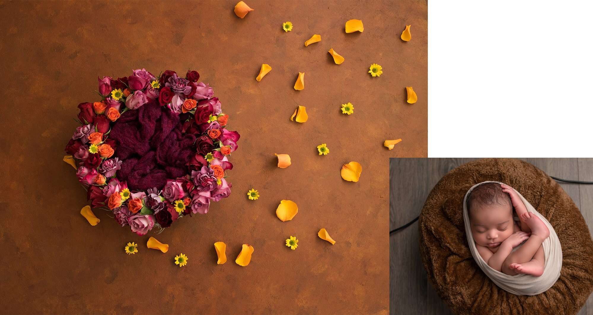 Because babies are brand new humans with wobbly heads, soft bones, and zero interest in following directions. Composites allow creativity—think baby cradled in a parent’s military cover, nestled among florals, or “resting” on a prop—without removing hands or support until editing time. Safety first; movie magic second. See more examples of newborn composites