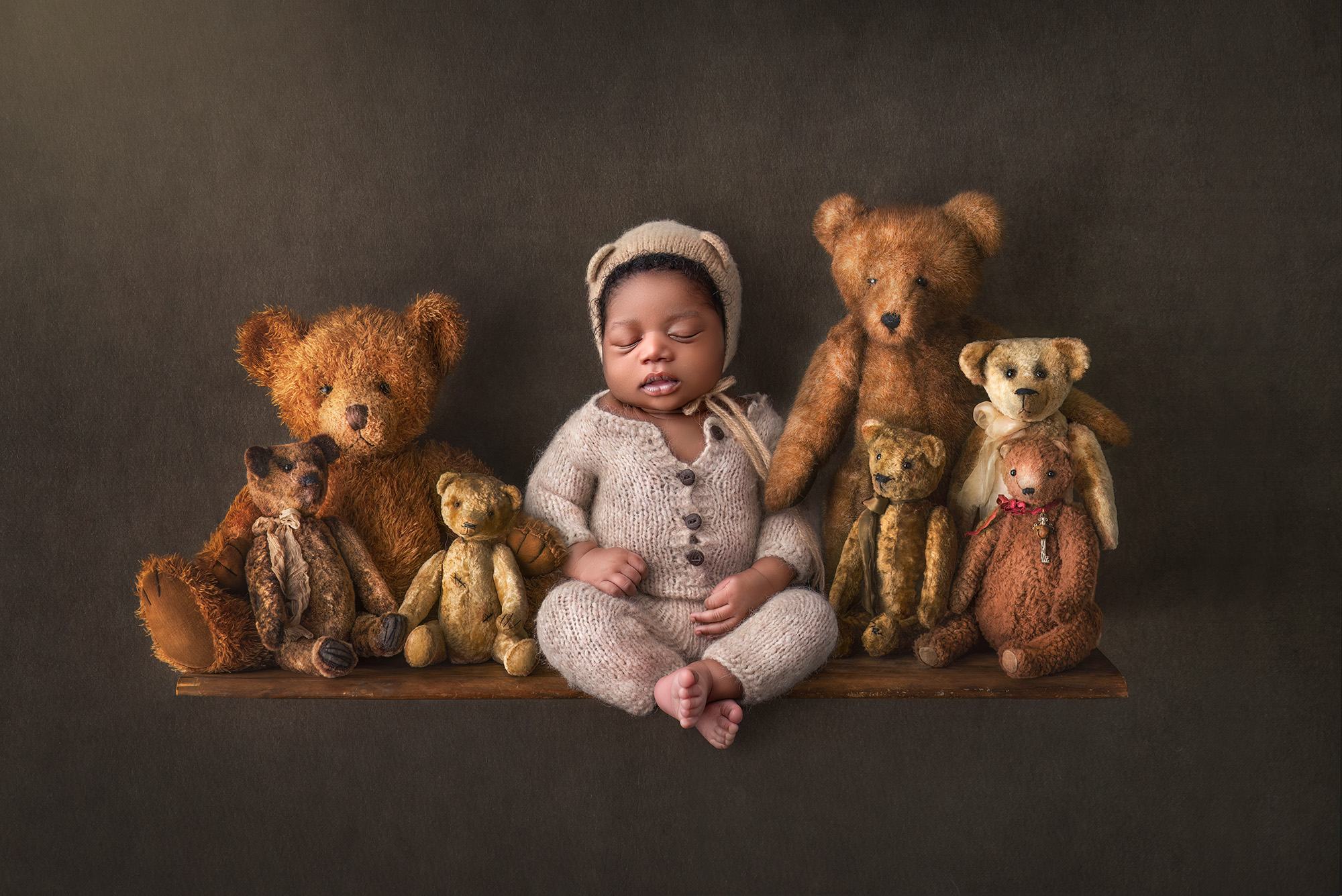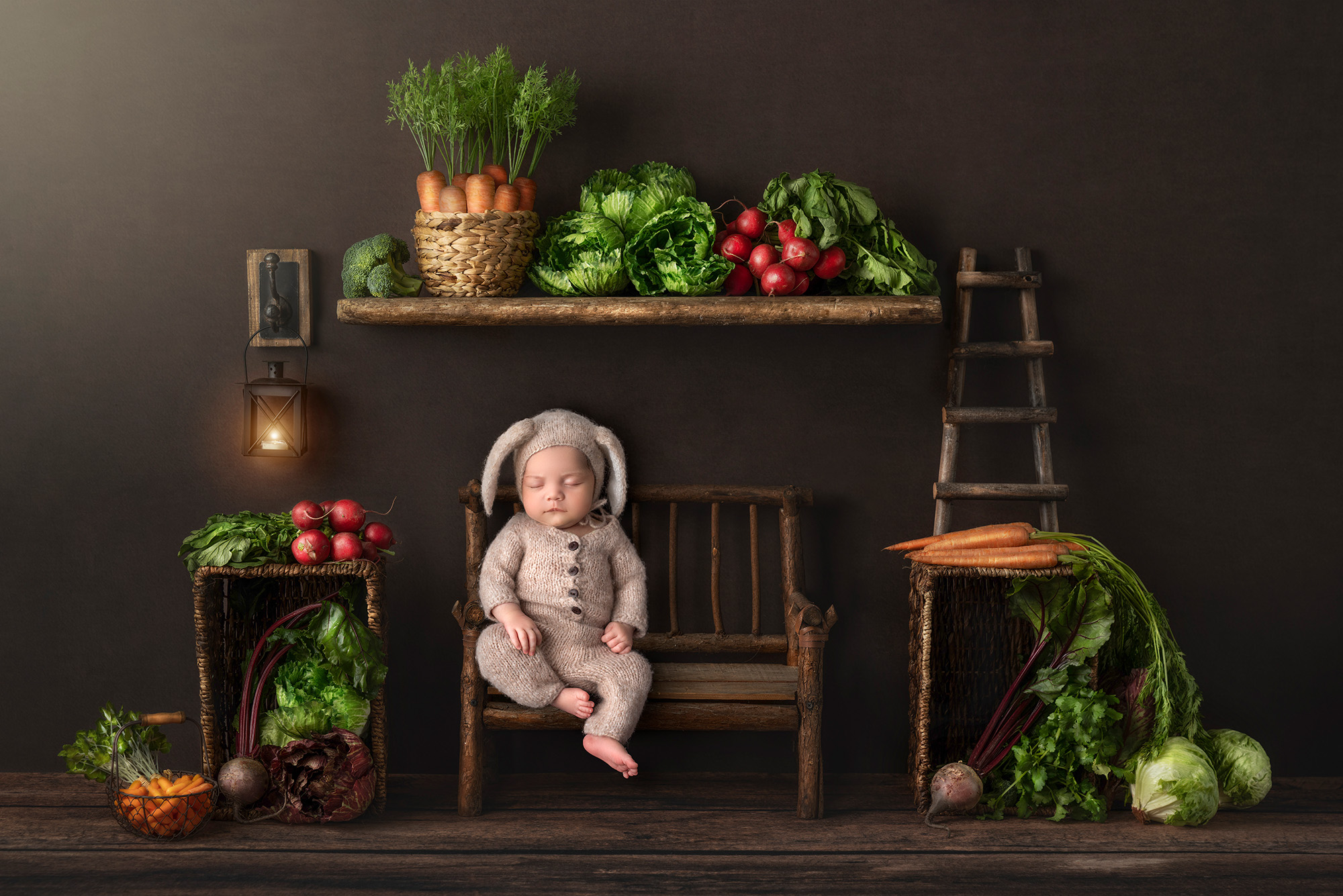 Because babies are brand new humans with wobbly heads, soft bones, and zero interest in following directions. Composites allow creativity—think baby cradled in a parent’s military cover, nestled among florals, or “resting” on a prop—without removing hands or support until editing time. Safety first; movie magic second. See more examples of newborn composites