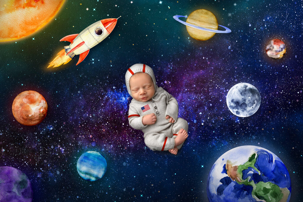 You and your photographer plan the concept: colors you love, heirlooms you want included, and any meaningful nods (service caps, a favorite book, a symbol from your culture). The photographer pre-visualizes how newborn composite photos will be built—what’s photographed in-studio, what’s added from a digital backdrop, and where hands will safely support baby in each frame.
