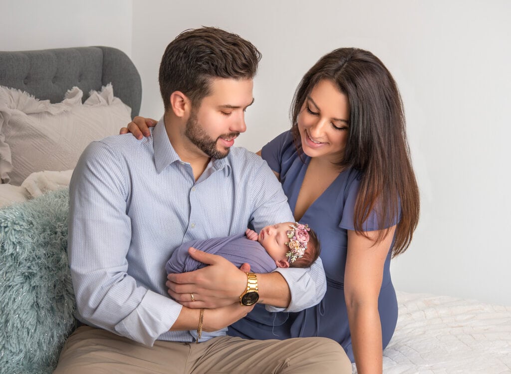 Looking at real sessions can spark ideas for your own newborn photo session outfits. Many photographers are featuring families dressed in baby blue, dusty rose, and light olive, creating a serene, modern vibe.