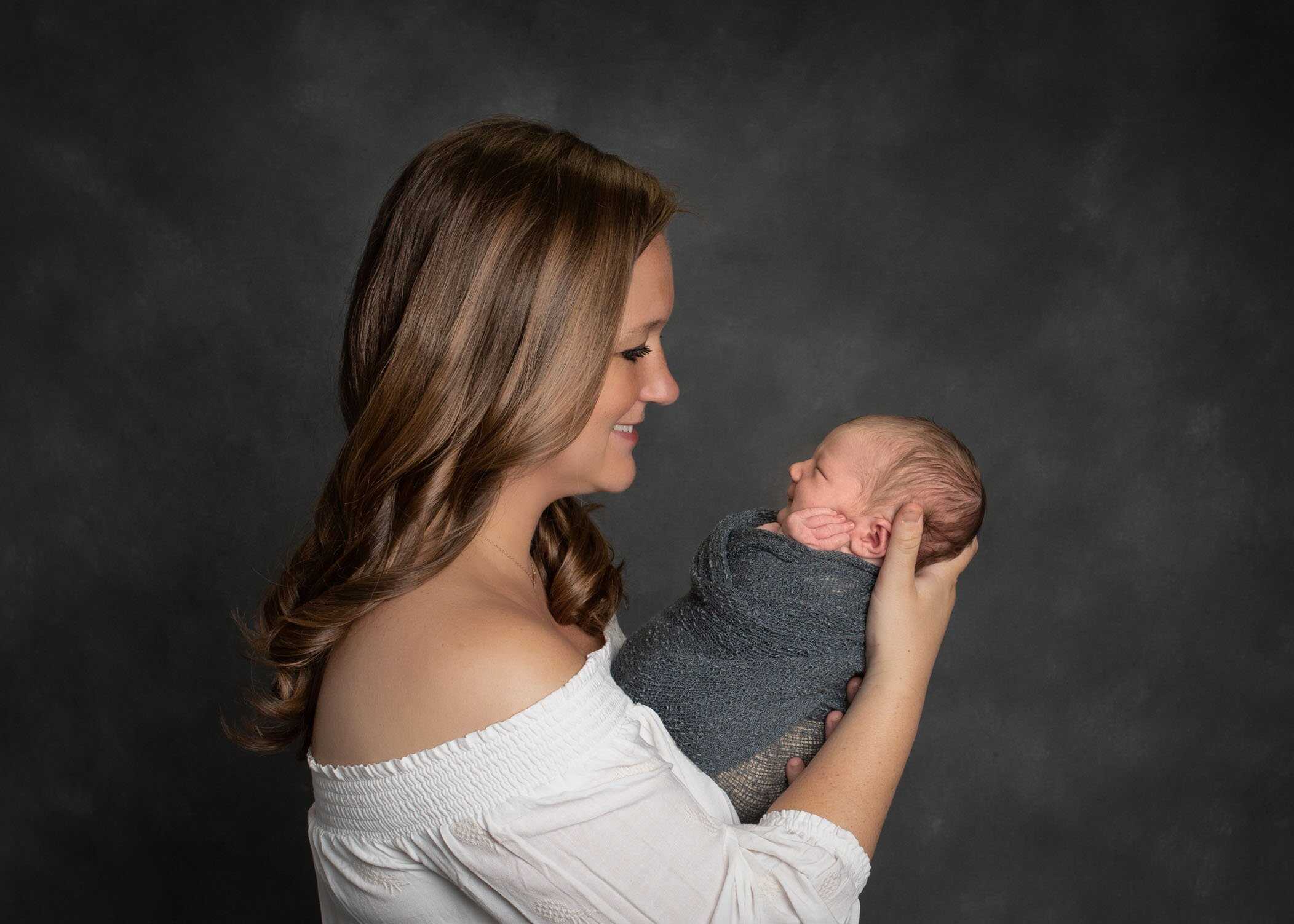 Mom enjoying a cheeky smile from her newborn son.