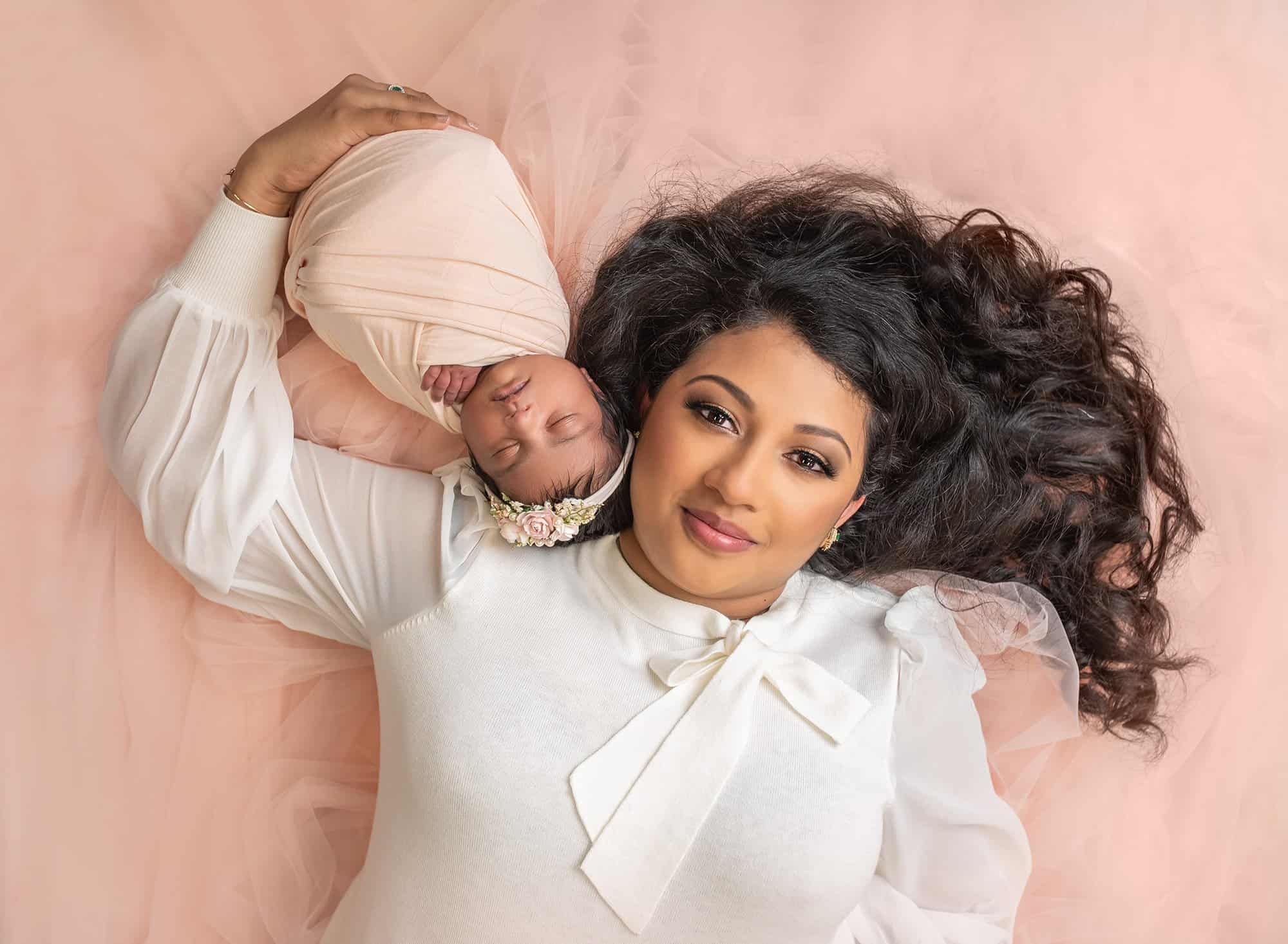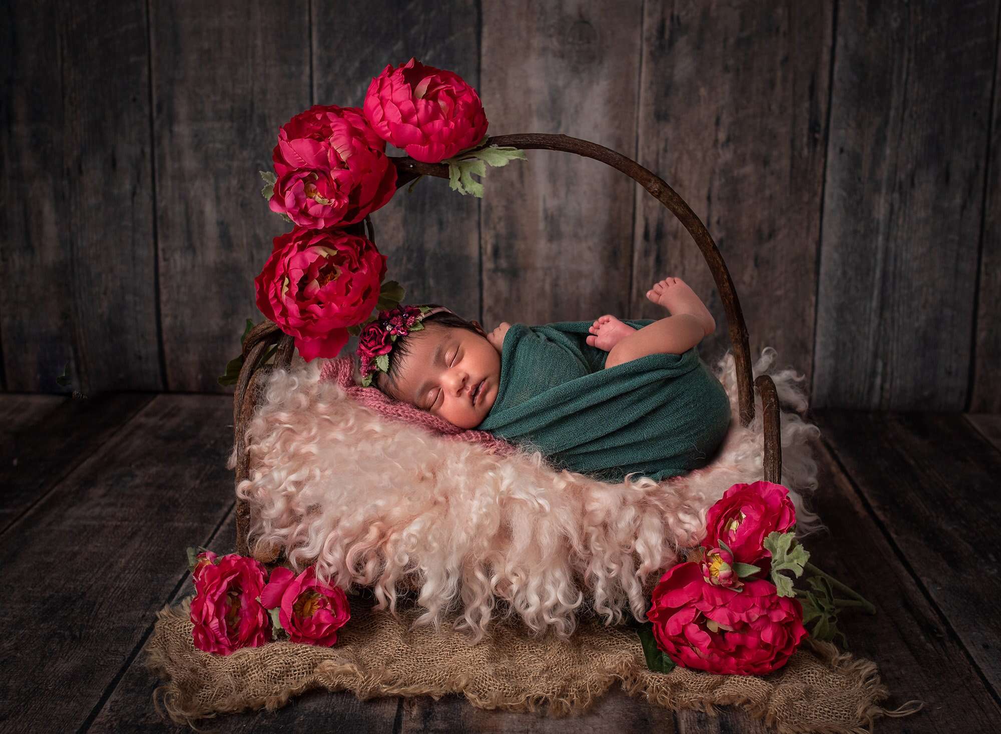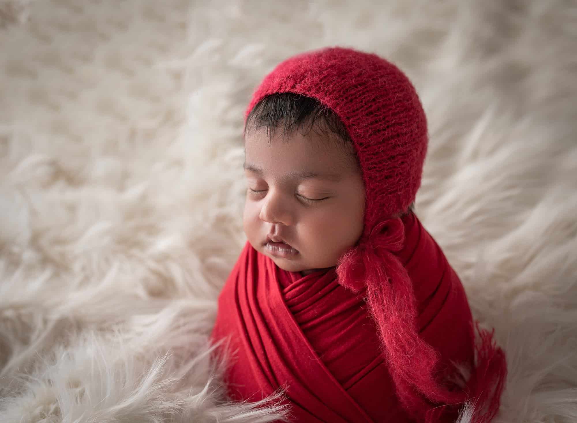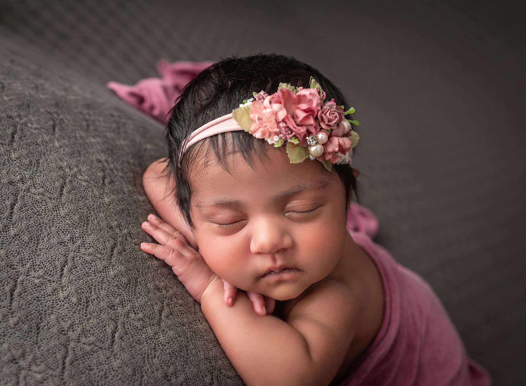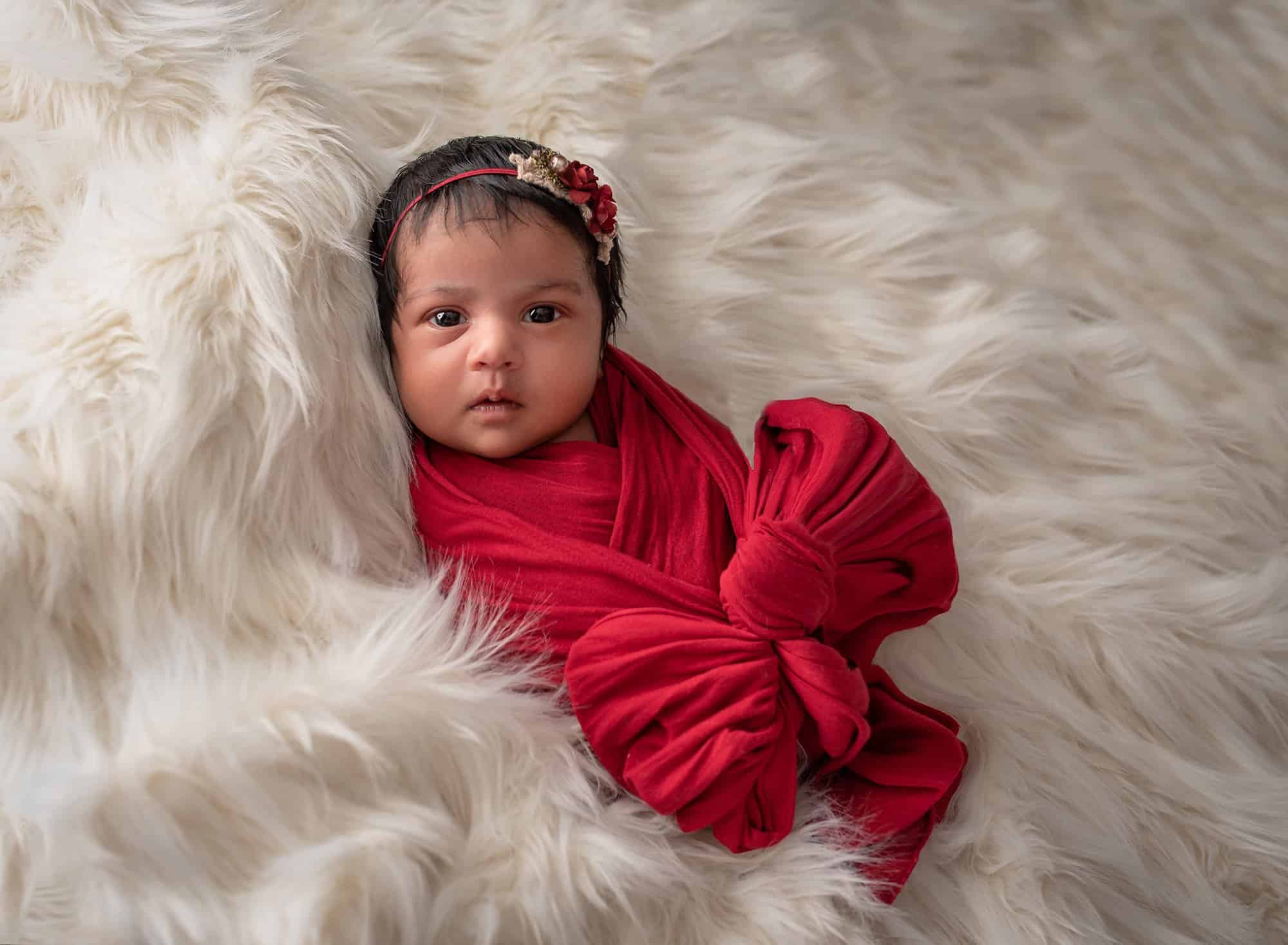 Mom and Dad came to me because they love the rich, vibrant colors and flowers I use in my photos. I happen to feel the same way, and I was thrilled to embrace that style for Navika’s newborn photos. We featured a collection of deep reds and delicate pinks for baby Navika, showcasing the beauty in her adorable newborn face.