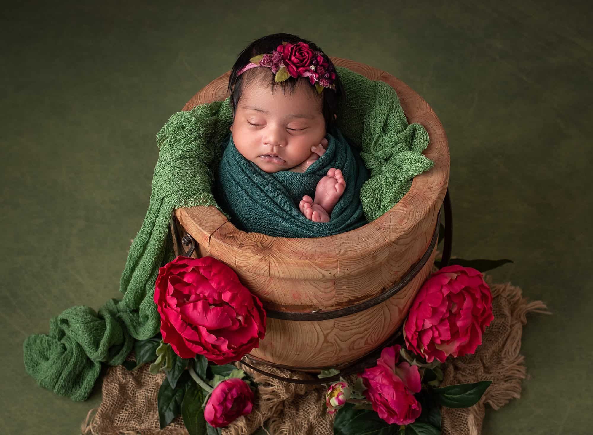 Mom and Dad came to me because they love the rich, vibrant colors and flowers I use in my photos. I happen to feel the same way, and I was thrilled to embrace that style for Navika’s newborn photos. We featured a collection of deep reds and delicate pinks for baby Navika, showcasing the beauty in her adorable newborn face.