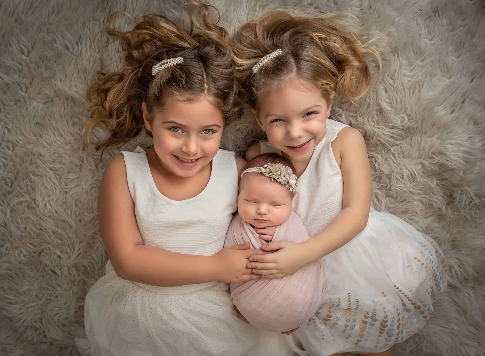 That’s when Mom called me and I was thrilled that I could fit her into my schedule. When the day of the session arrived, it was a joy to meet this beautiful growing family. I was absolutely enchanted with big sisters Stella and Olivia! They were perfect angels throughout the entire session, cooperating so well with everything I asked of them during their photos. It was clear that they truly treasure their baby sister, and I loved finding ways to capture that love on camera.