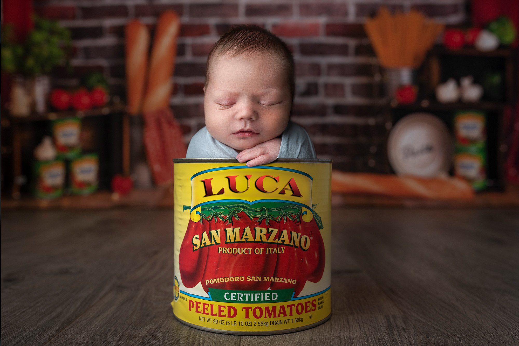 Dad also wanted to pay homage to his Italian heritage in Luca’s photos, and that didn’t take quite as much adventurism. We created a great shot of Luca sleeping in a can of tomatoes with more Italian imagery in the background.