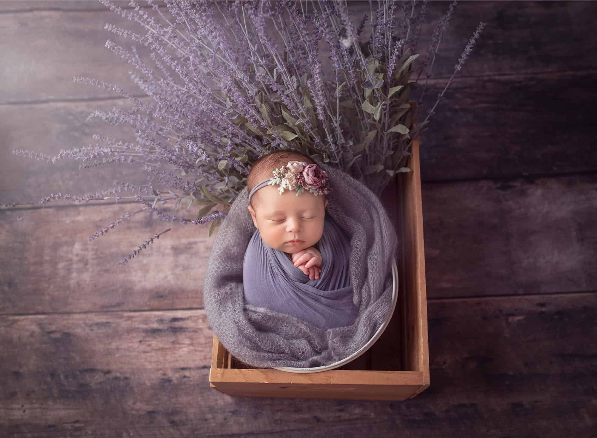 What better way to start a lavender newborn session than with Raven swaddled laying in a crate with lavender blooms? It turned out SO cute! Her floral headband was the perfect accessory too! We got another really precious shot of her laying on a white fluffy bed surrounded by more florals and holding on to the tiniest little stuffed bunny. It was just dreamy! Hands down though, my favorite is her all swaddled up wearing a little rhinestone crown headband. She has the sweetest little smile on her face! She was just such a lovely baby to photograph.