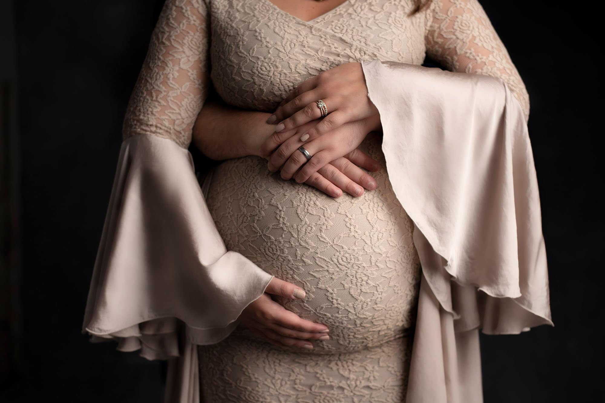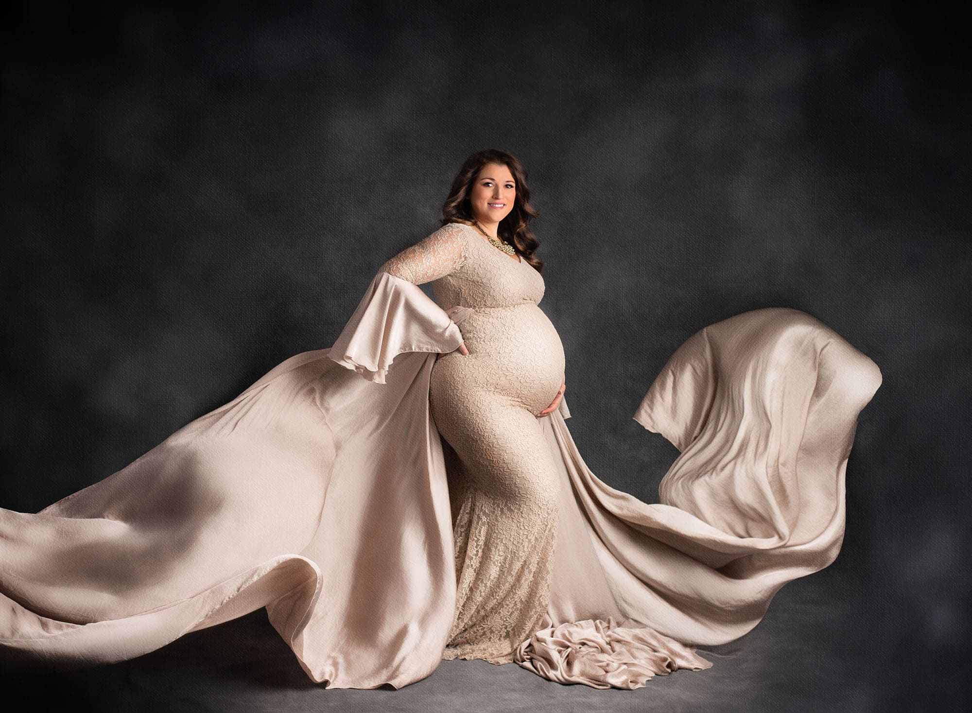 We started out with her in a champagne colored lace gown that is just absolutely stunning! With her rich, dark hair, she looked positively radiant! We took some lovely photos of her holding her belly and brought dad to be in the shot to grab some pictures with her too. One of the reasons she picked this gown was because of how drapey and flowy it was with silk bell sleeves and a silk train. She loved taking the pictures of the dress flowing in out all around her, and I loved how it turned out! Breathtaking!