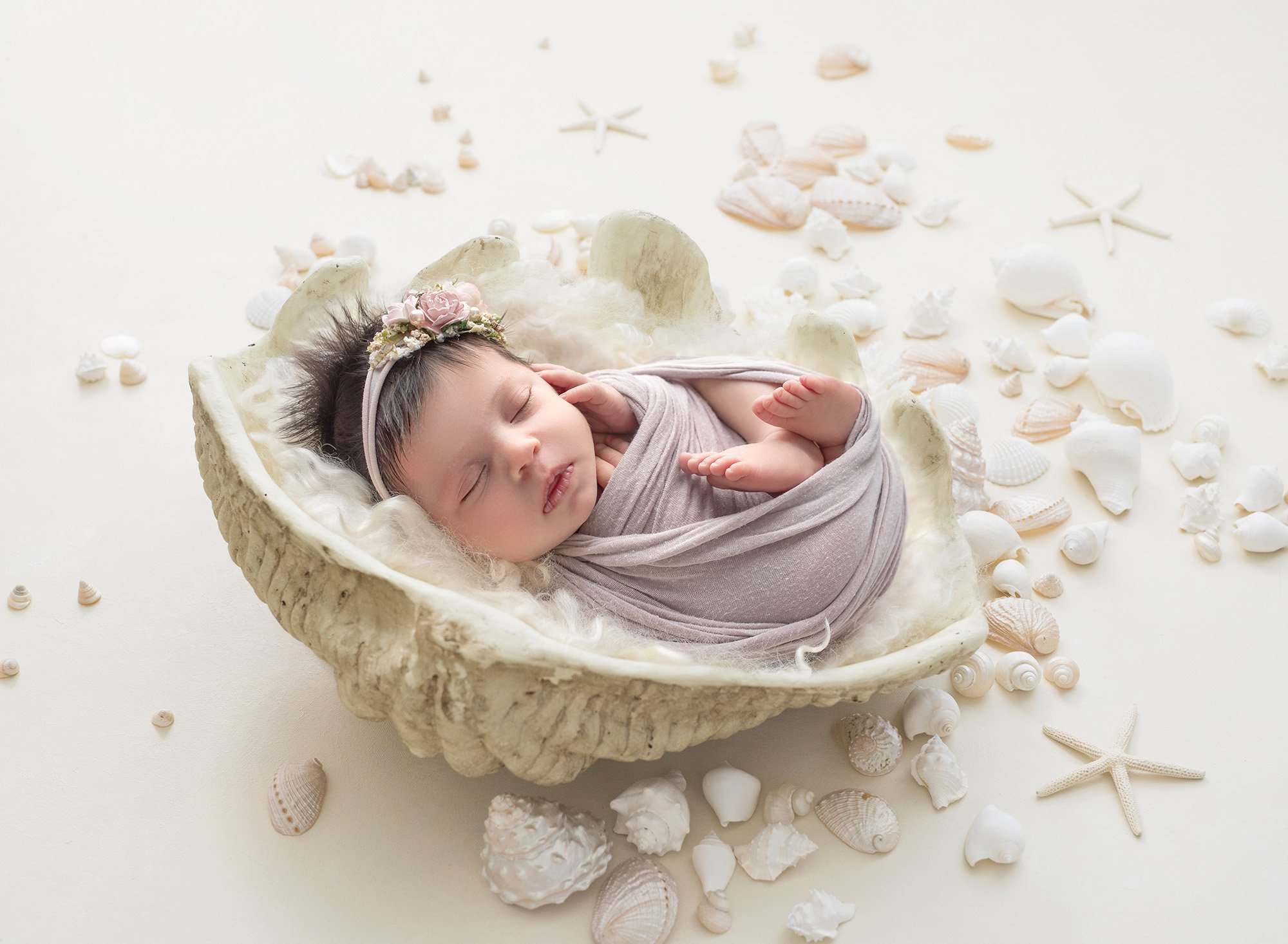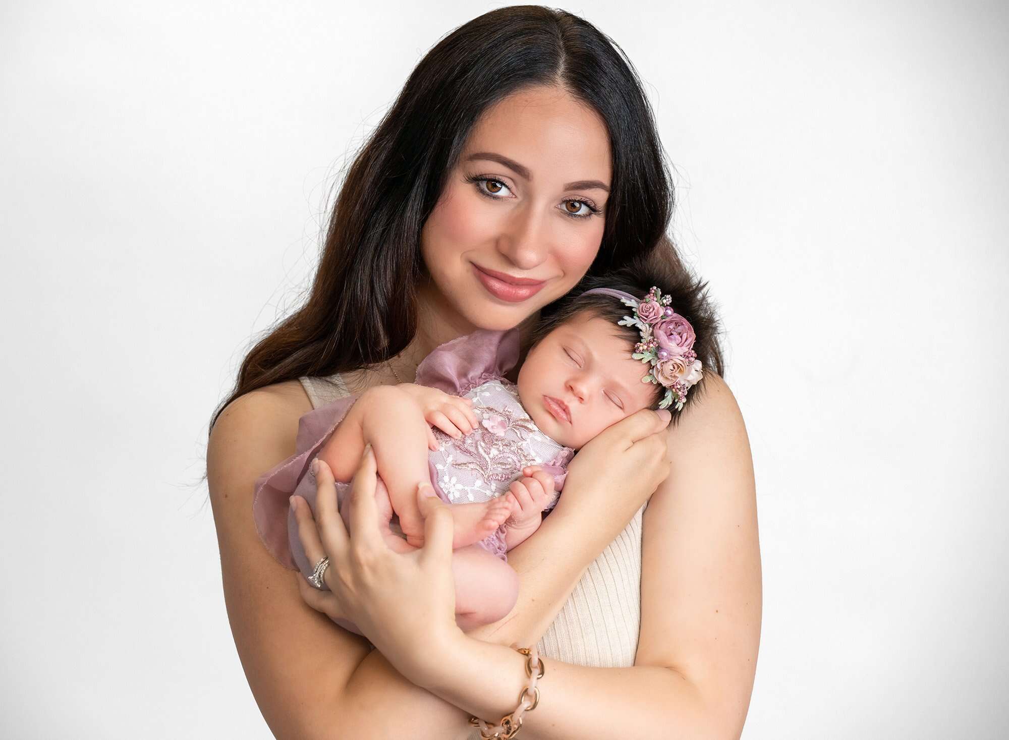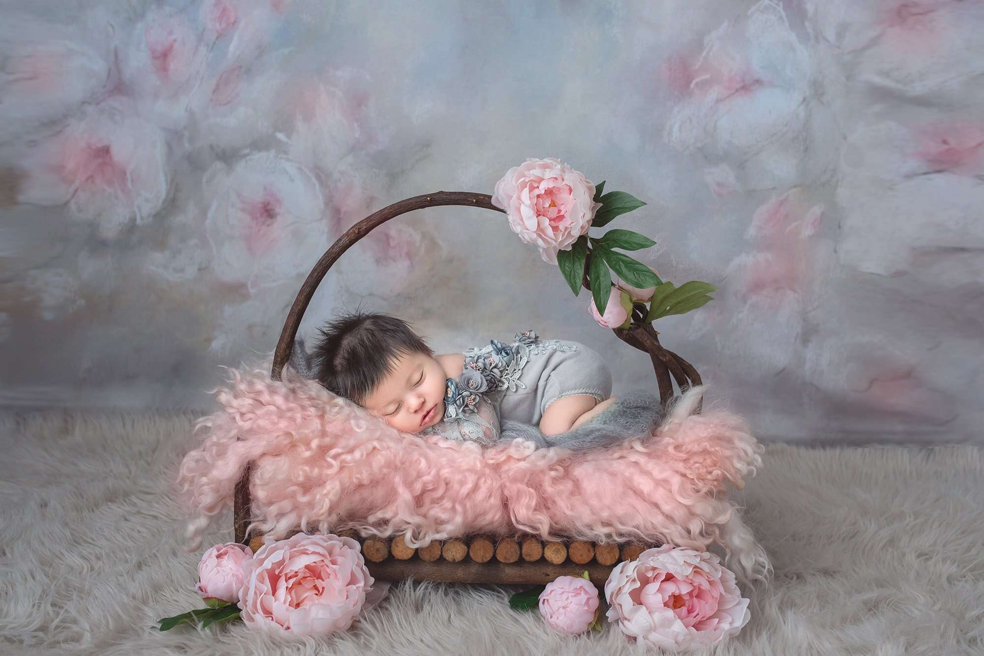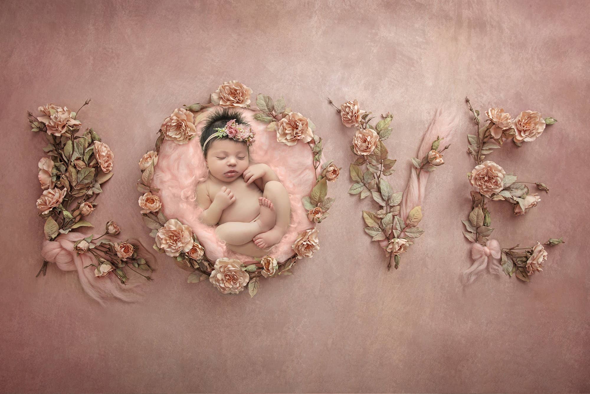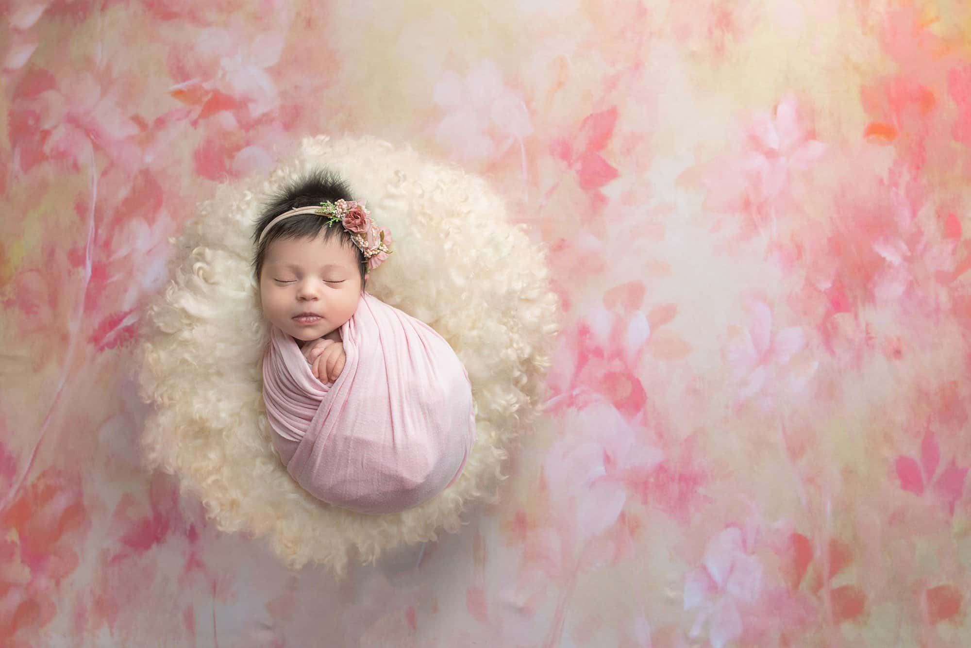 Fortunately, this was in my wheelhouse as a newborn baby photographer who’s seen my fair share of girly girls. To start, we played with floral backgrounds to highlight Elliana as the natural beauty she is. Her gallery wouldn’t have been complete without lace and pearls, of course, and we even snapped a perfect photo on a unique abstract pink background.