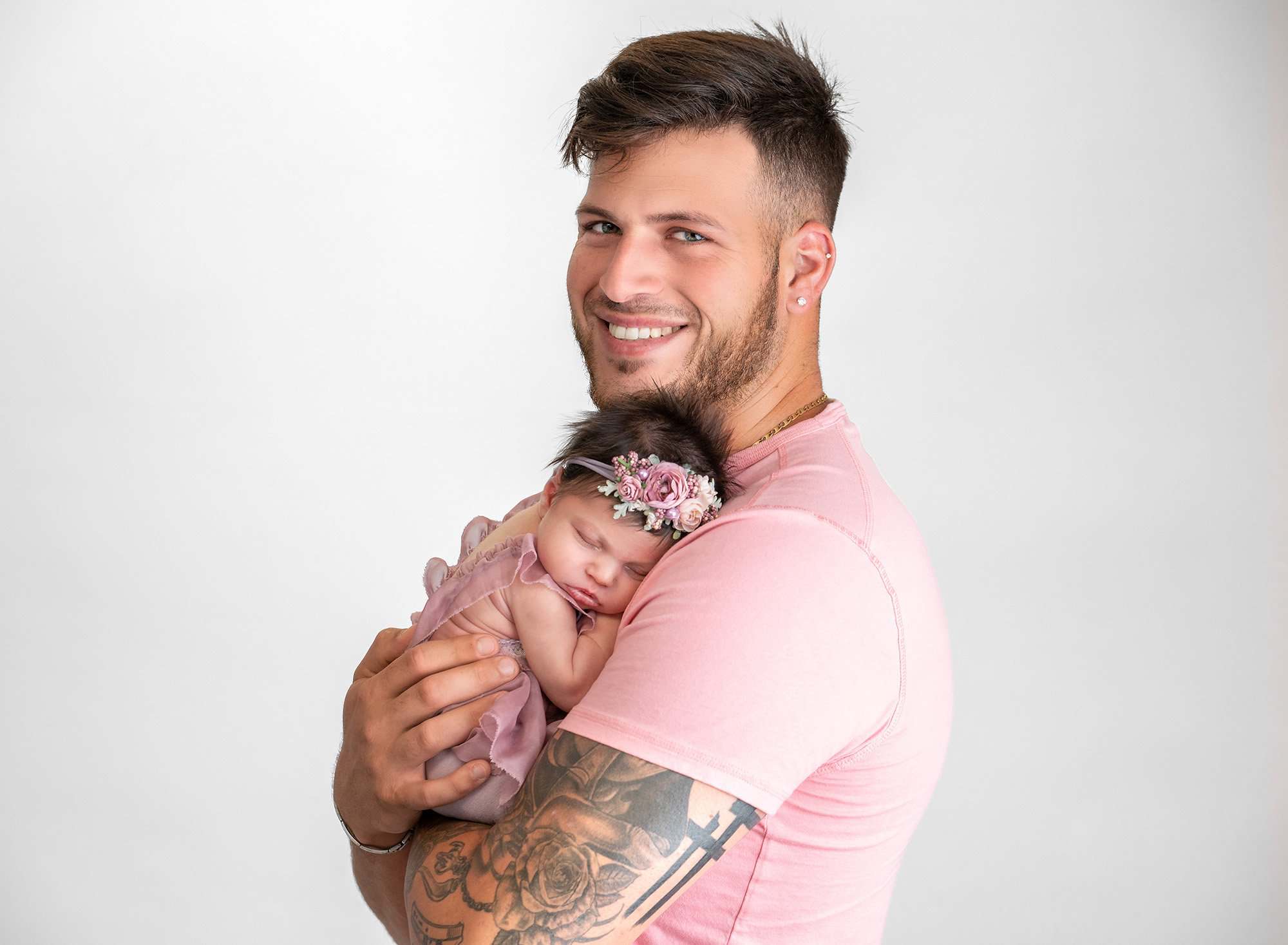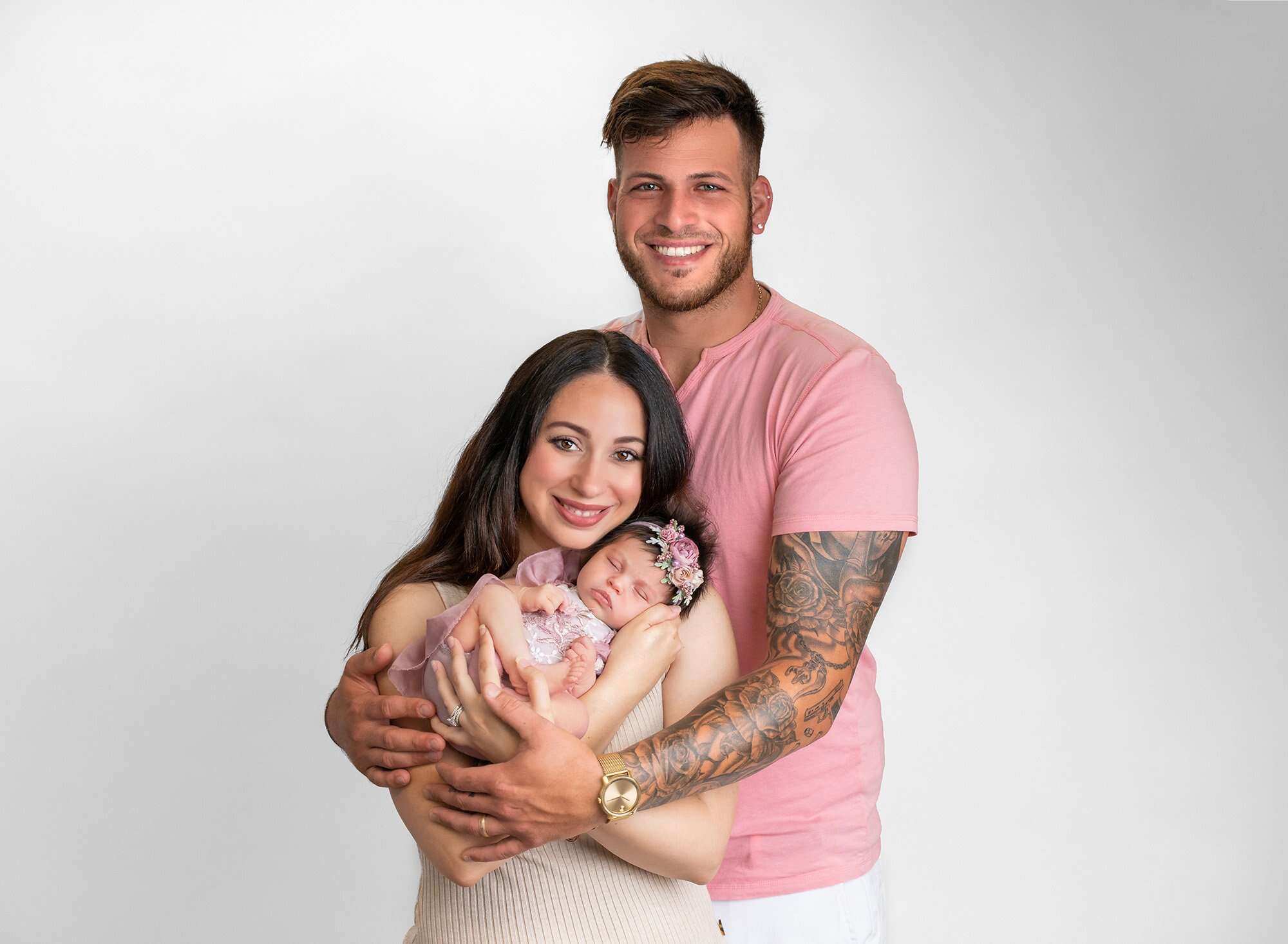 Throughout the entire session, Mom and Dad were beaming over their sweet little girl, and it shows through in their photos with Elliana. The bond between mother and daughter is already clear in their portraits, and it’s difficult to tell which is more touching: that thriving bond or the adorable image of Elliana’s tall, masculine dad cradling his tiny daughter in such a gentle yet protective way. He was even happy to play along with the feminine aesthetic of the photo session by dressing in pink to complement his girls.