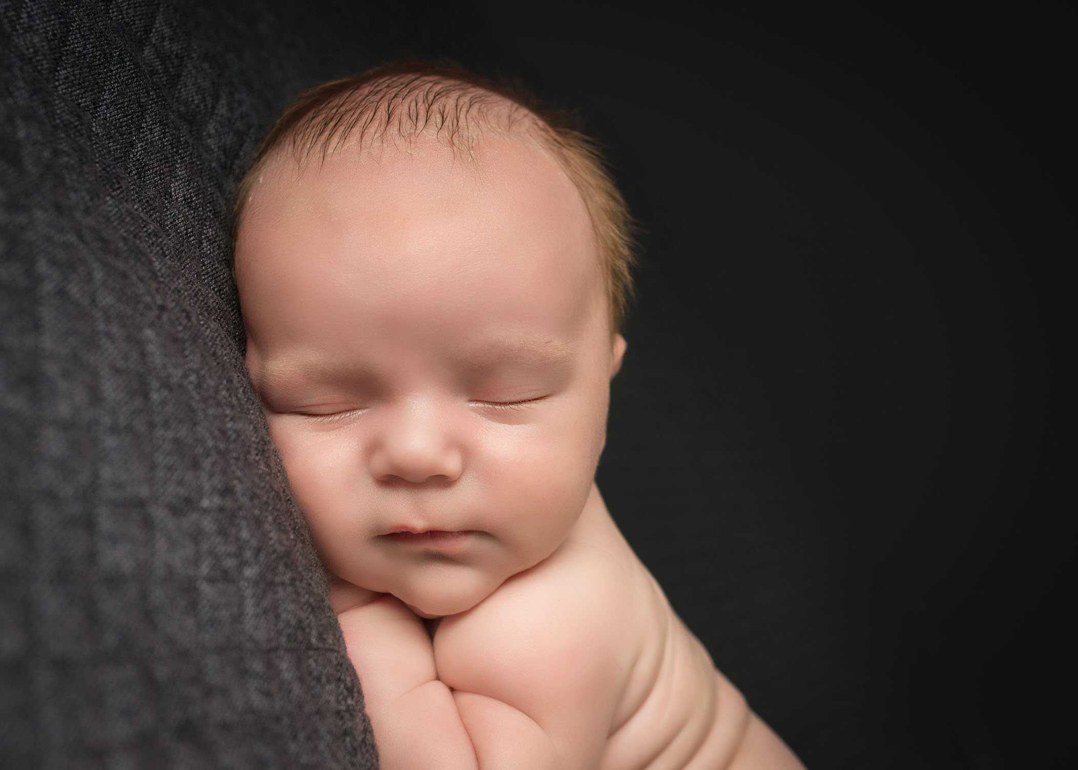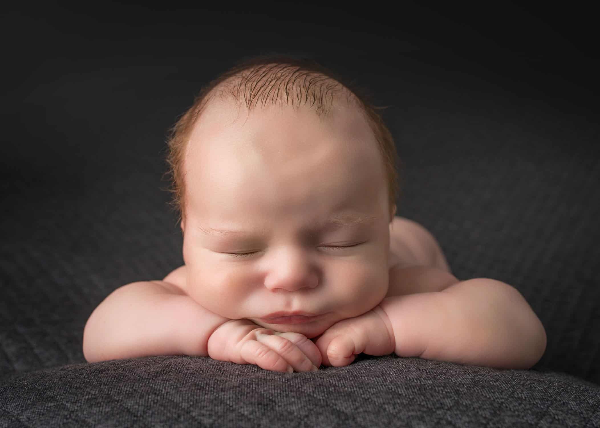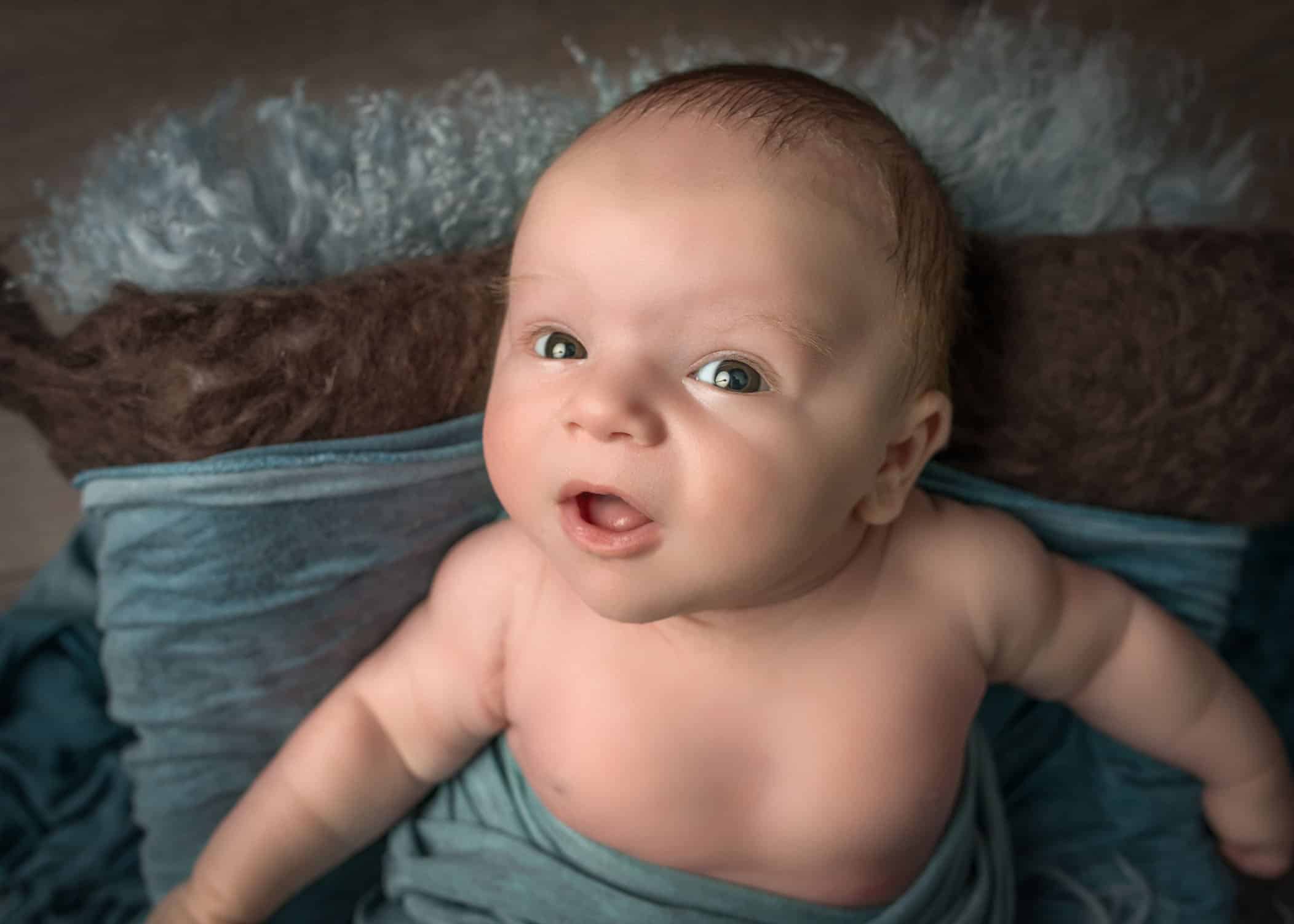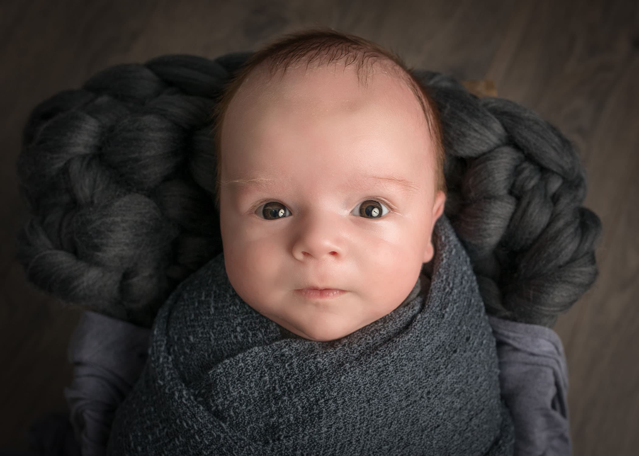 Sweet little Benjamin was 6 weeks old when we got him into my studio for his professional baby pictures. Completely asleep when he arrived, I thought my job was going to be a breeze. But Benjamin is one of those “not going to miss a thing” babies, so he was awake for 90% of his newborn photo session. Looking at this adorable photo though, him being awake worked out just fine.