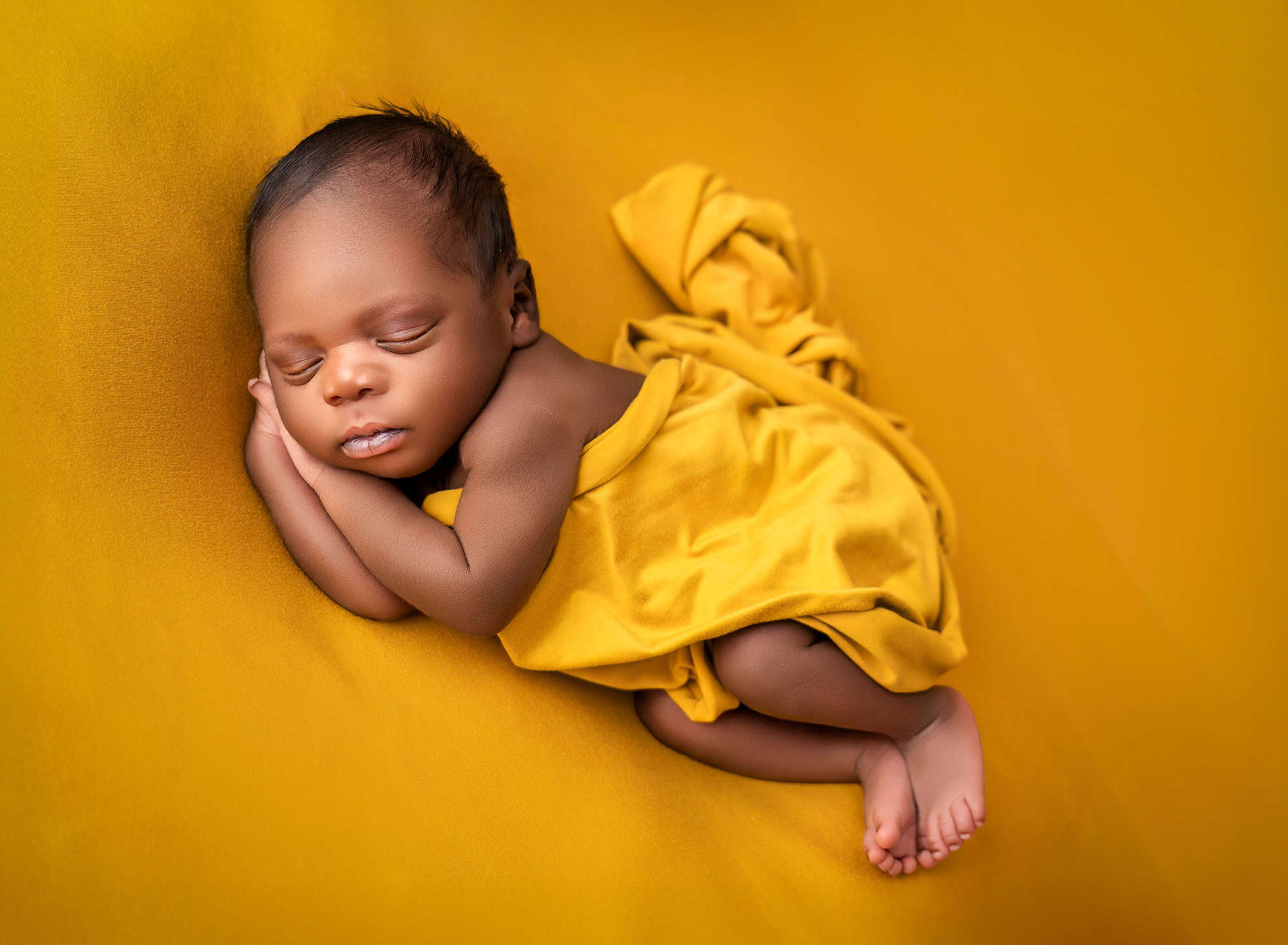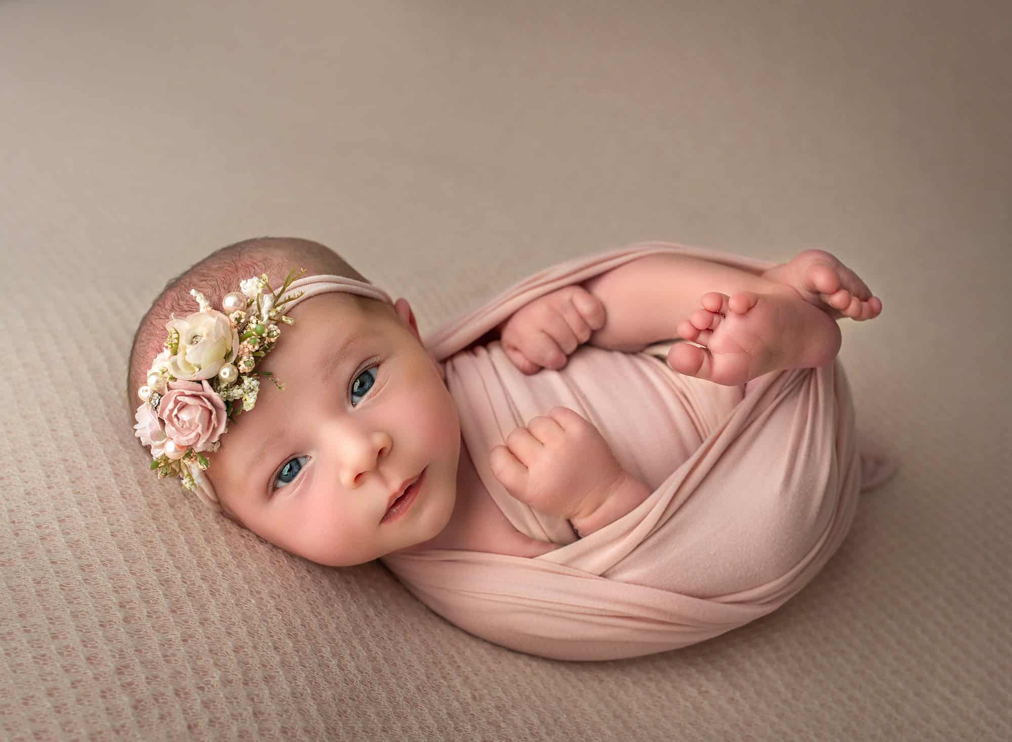 Once your baby is past one month, we often see more wakefulness and lots of adorable stretches and kicks. Sleepy portraits are still possible, but awake images may lead the gallery. Swaddling keeps baby cozy and allows us to capture calm expressions without the startle reflex interrupting the moment.