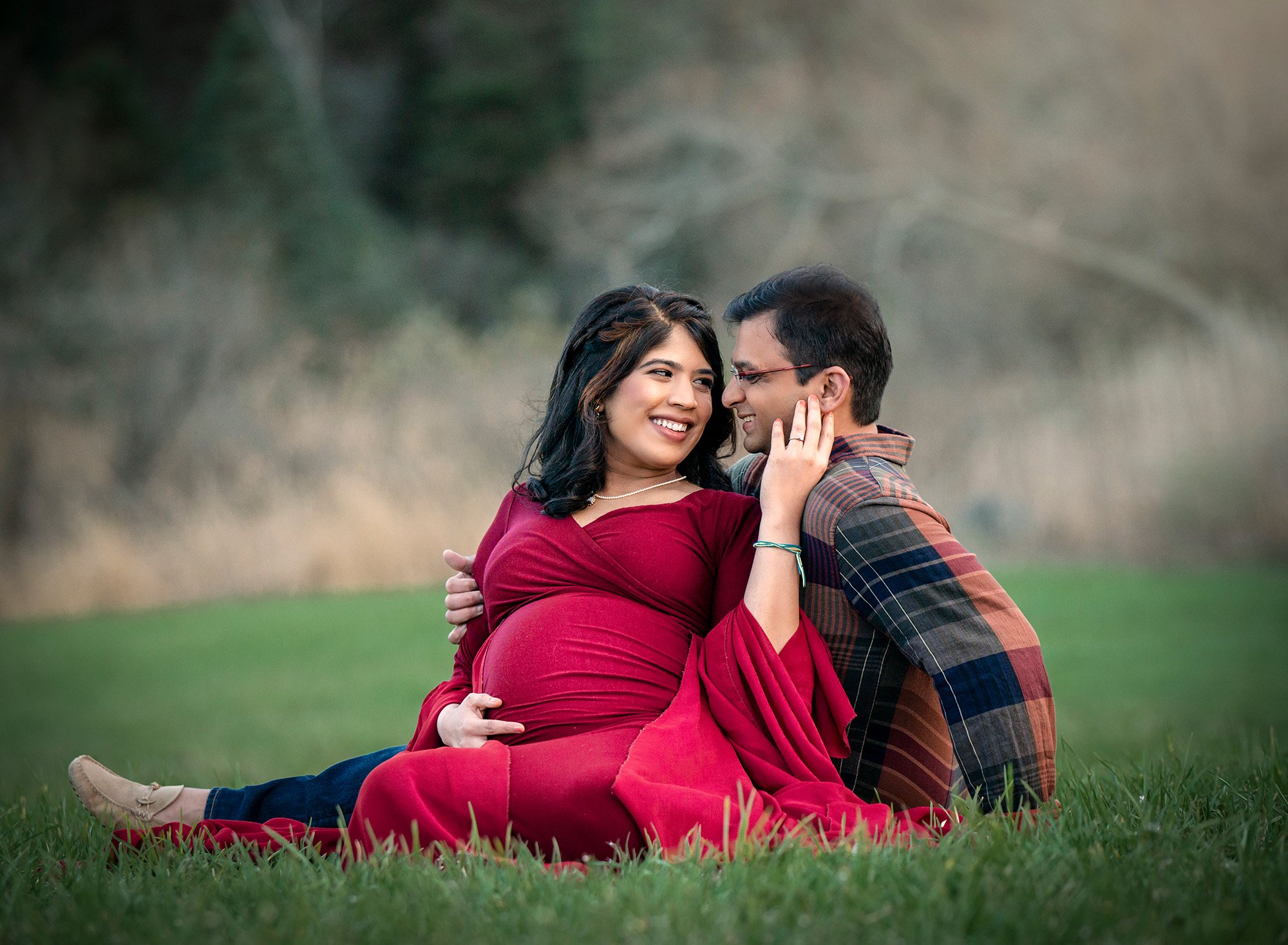 While these soon-to-be parents’ smiles of pure excitement are the clear stars of their maternity portraits, I also can’t take my eyes off that dramatic red maternity dress. It complements mom-to-be so well, and it’s a stunningly bold focal point against the faded background of winter trees.